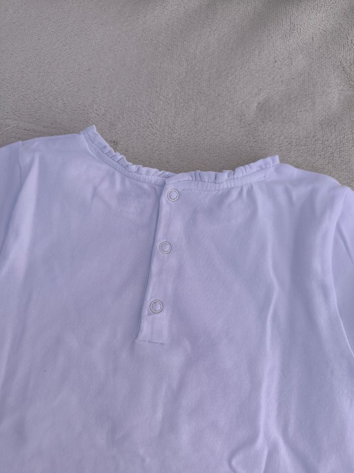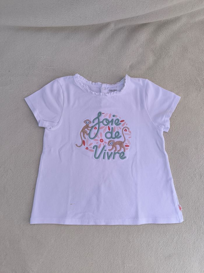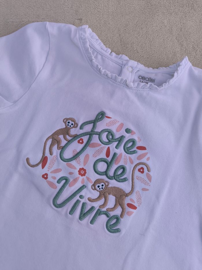 T-shirt à manches courtes Marque Obaïbi Taille 3 ans, 98 cm • Coloris blanc, rose, vert • Imprimés, broderies singes, "Joie de vivre" • Pressions au dos • Col volanté • Tissu fin • Petites taches En bon état #evelyne_filles_3ans #evelyne_filles