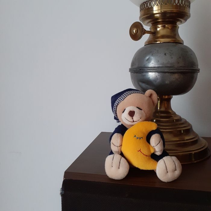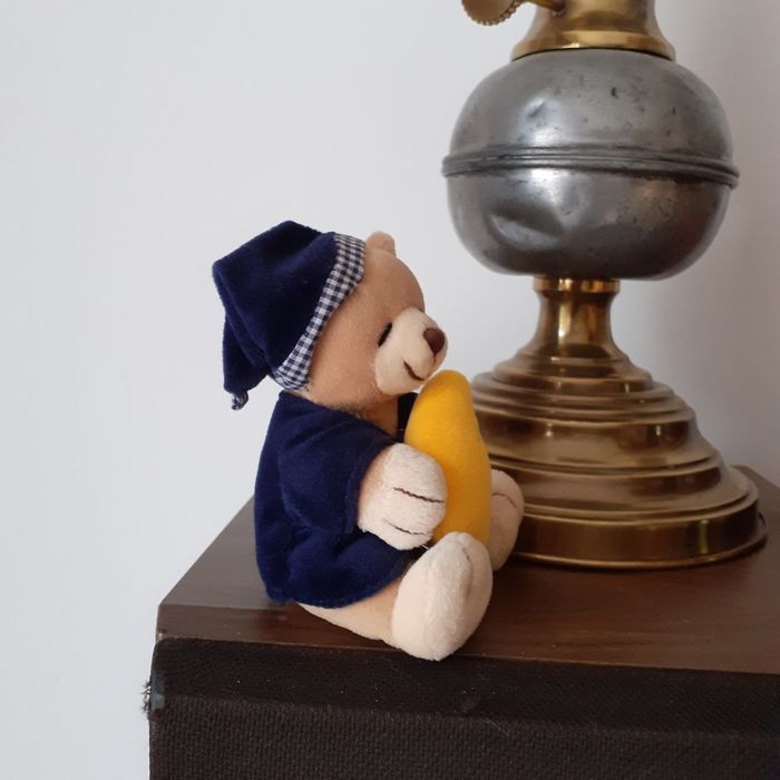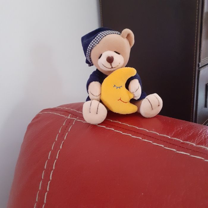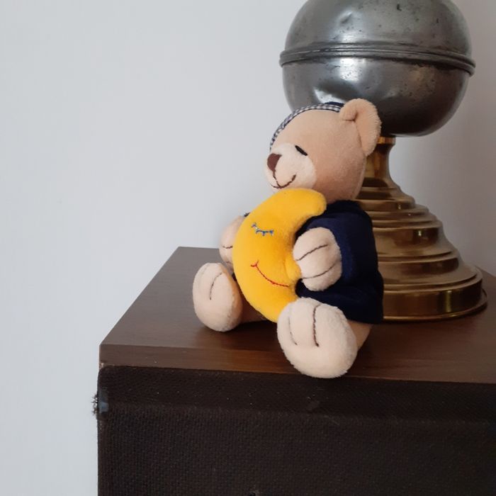 Petite Peluche-doudou entièrement rembourrée. Ourson en position assise, tenant son doudou Lune🌛. Yeux et museau brodés; vêtements non amovibles; l'une cousue aux pattes de l'Ourson. Hauteur totale de 11 cm. Bien noter les dimensions // voir photos pour détails
