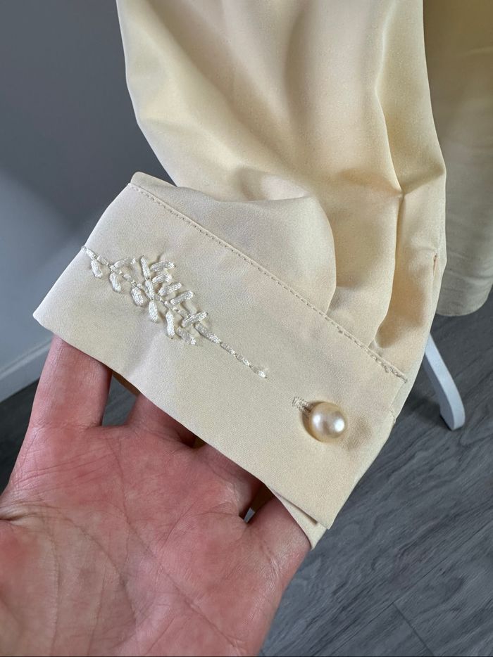 Chemisier - Excellent état - Taille FR 54 équivalent 7XL Dimensions en bas de l’annonce - Couleur beige crème - Broderies fleurs au niveau du col et des manches - Tissus fluide - Manches longues - Se ferme avec des boutons - 100% polyester - Vintage, années 80’ Dimensions: - 66cm niveau aisselles - 79cm de long