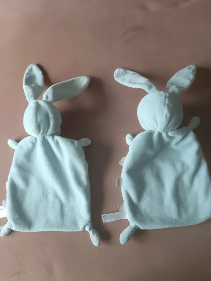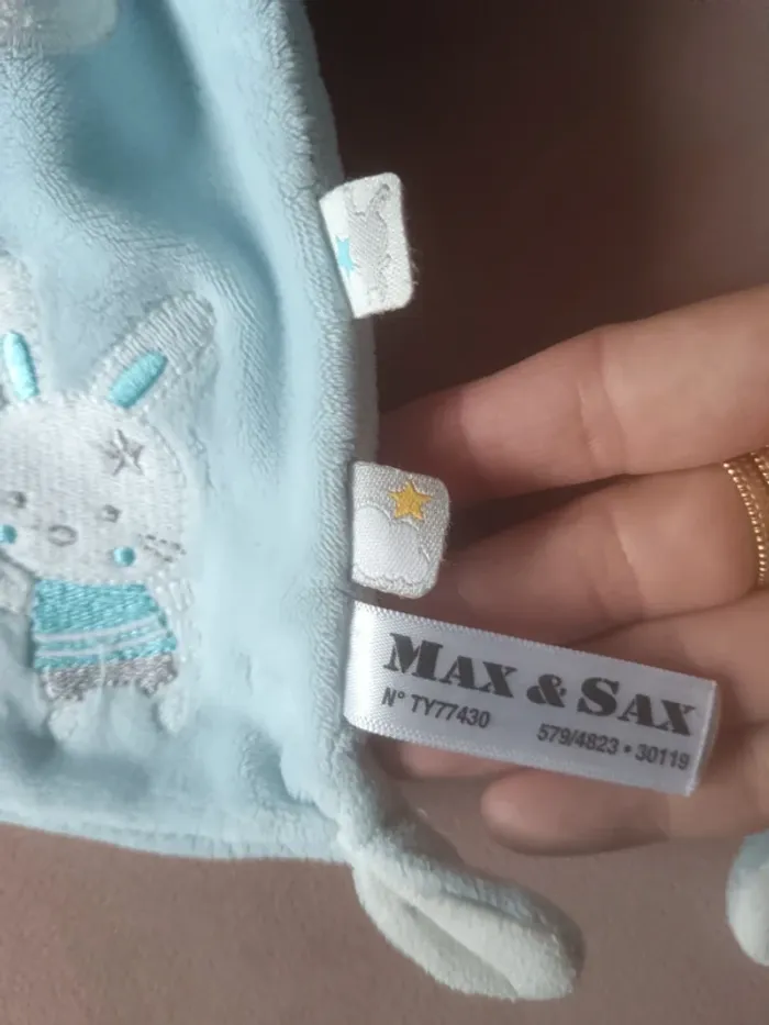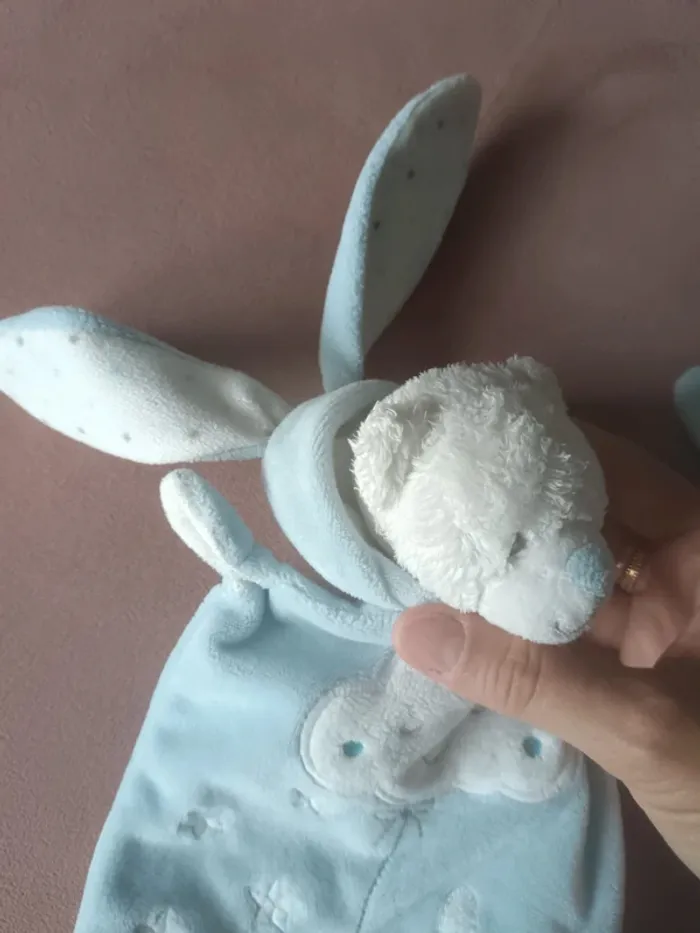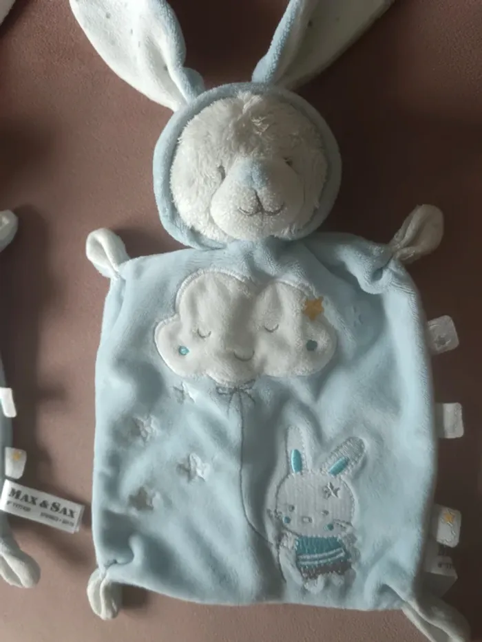Doudous plat Ours blanc et bleu lapin brodé nuage étoiles Max & Sax Carrefour, la broderie est légèrement phosphorescente dans le noir quand le doudou a été exposé à la lumière avant, très apprécié de bébé. Ours déguisé en lapin, doudou qui ont légèrement servi mais encore en très bon état. Je préfère les vendre en lot si possible Je l'ai également en rose dans mon dressing si besoin