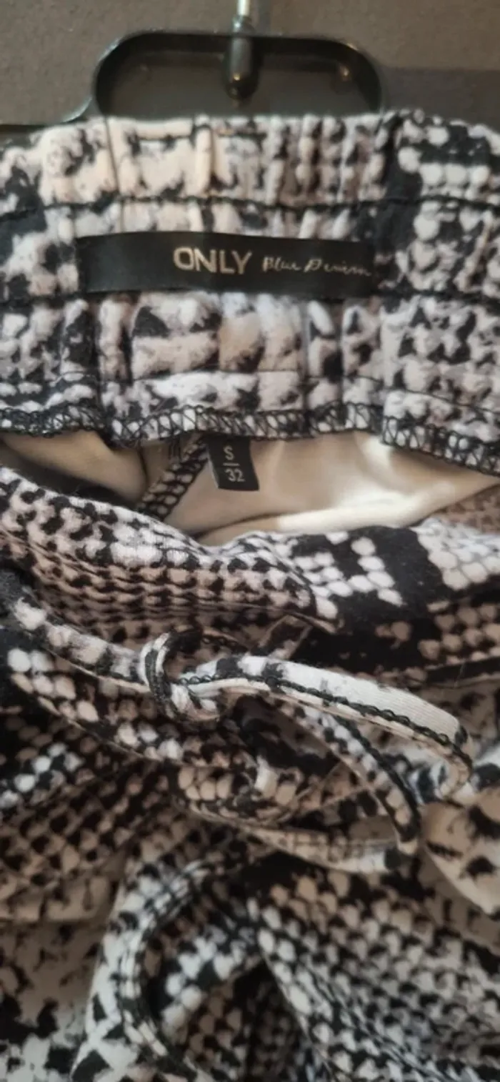 Ce pantalon ONLY, avec son motif serpent tendance, est parfait pour ajouter une touche audacieuse et moderne à votre garde-robe. Son imprimé animalier et sa coupe confortable en font une pièce unique et stylée. **Caractéristiques :** - **Marque :** ONLY - **Collection :** Blue Premium - **Motif :** Serpent (noir, blanc et gris) - **Taille :** S / 36 - **Matière :** Tissu léger et élastique pour un confort optimal - **Coupe :** Droite, avec une légère élasticité à la taille - **État :** Très bon état Idéal pour les tenues décontractées ou habillées, ce pantalon saura attirer les regards et compléter votre style avec élégance.