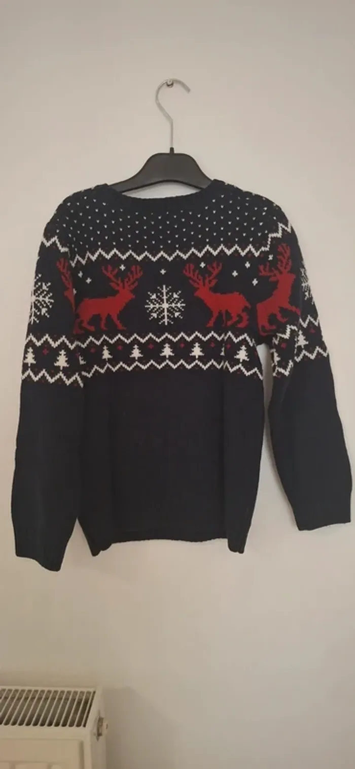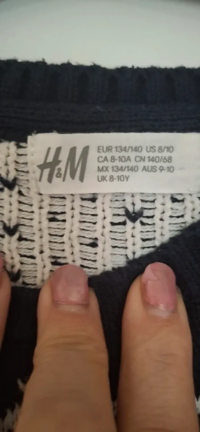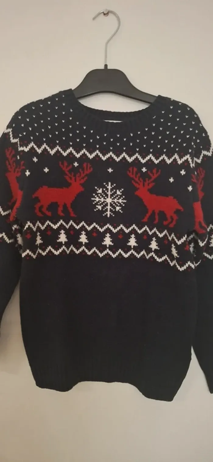 Ce joli pull de Noël à motifs de rennes et flocons est parfait pour les fêtes de fin d'année. Chaud et confortable, il apportera une touche festive à la garde-robe de votre enfant. **Caractéristiques :** - **Marque :** H&M - **Couleur :** Noir avec motifs rouges et blancs - **Taille :** - EUR : 134/140 - US : 8/10 - UK : 8-10Y - **Motifs :** Rennes et flocons de neige - **Matière :** Laine ou mélange laine (doux et chaud) - **État :** Très bon état Idéal pour les fêtes de fin d'année, ce pull apportera une ambiance festive et chaleureuse.