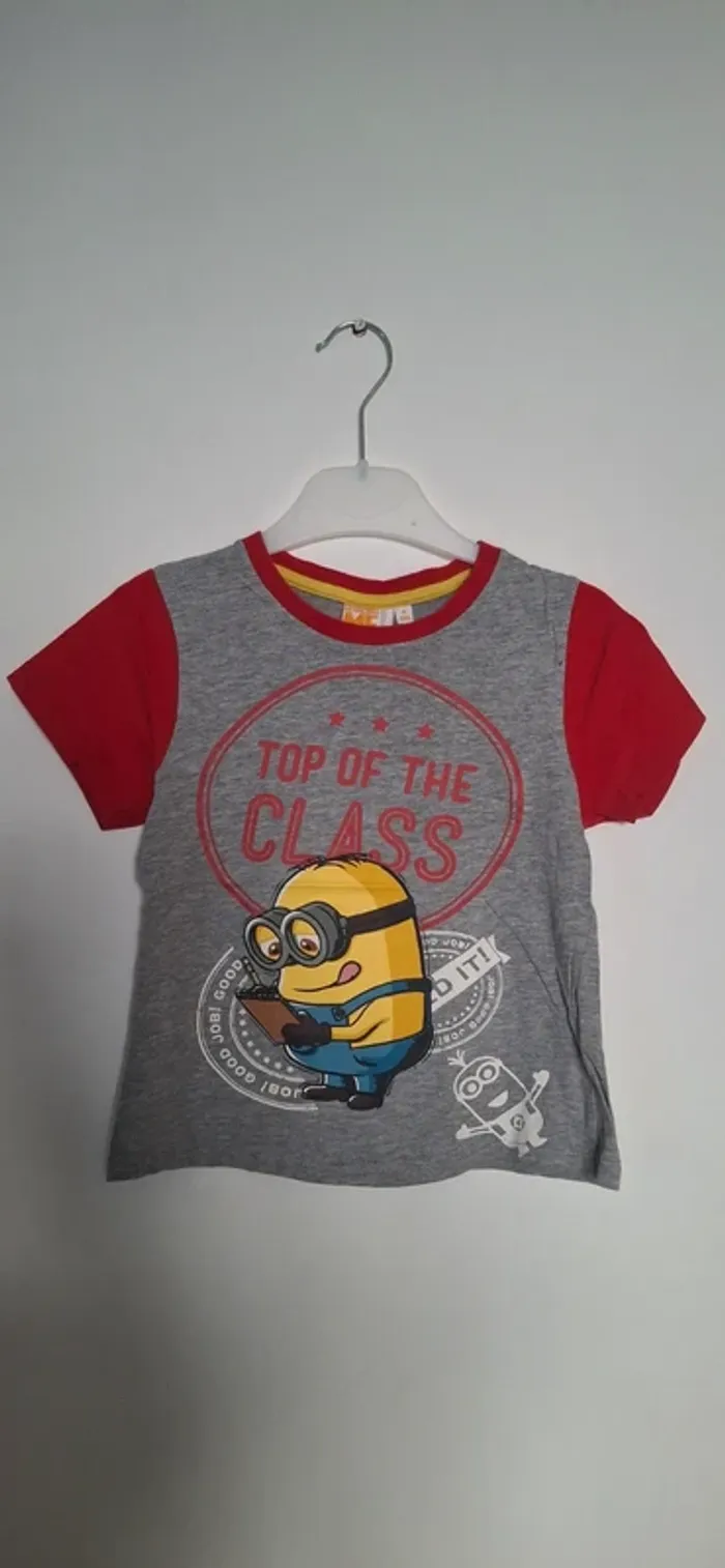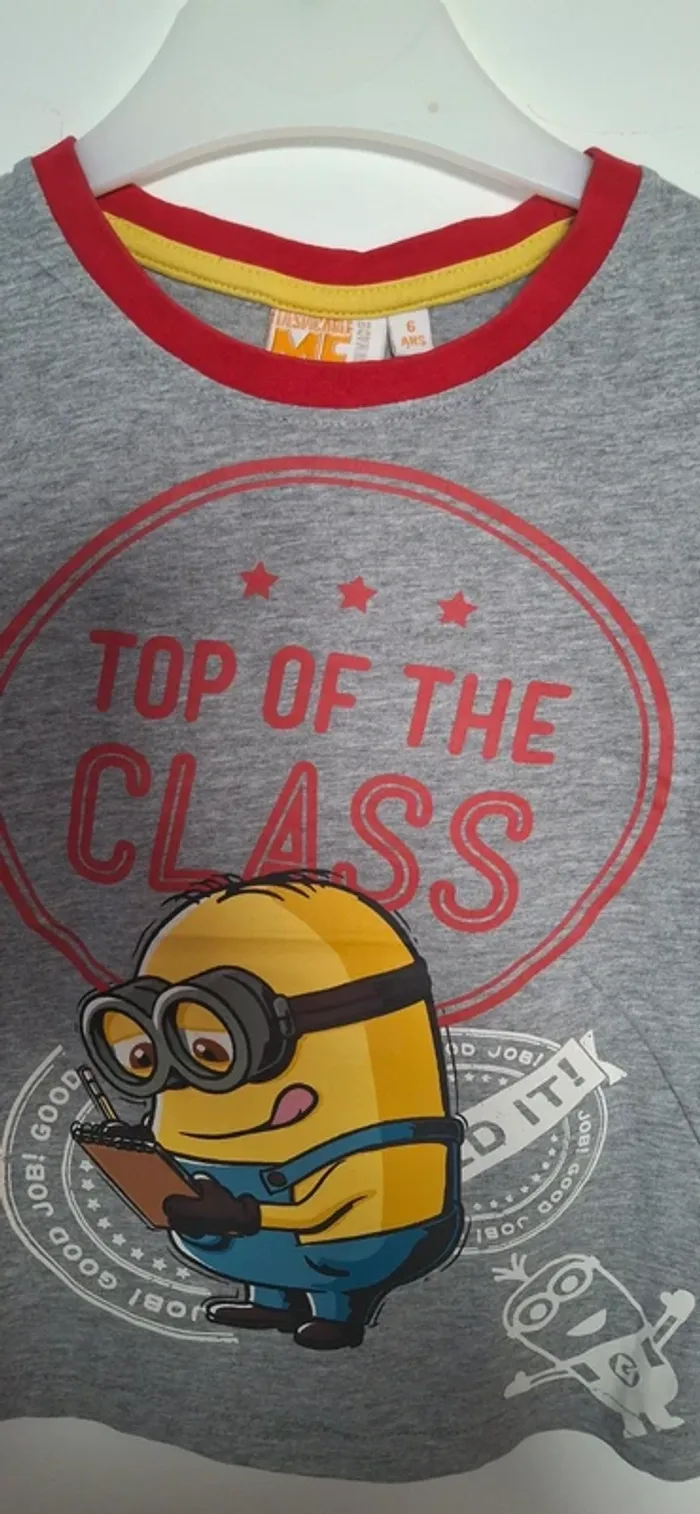 Haut de pyjama gris et rouge avec un motif "Top of the Class" et un Minion. Parfait pour un look décontracté et amusant. **Caractéristiques :** - Motif : Minion avec le texte "Top of the Class" - Couleur : Gris avec accents rouges et jaunes - Taille : 6 ans - État : Bon état Idéal pour les nuits confortables. Ajoutez une touche de fun à la garde-robe de nuit de votre enfant !