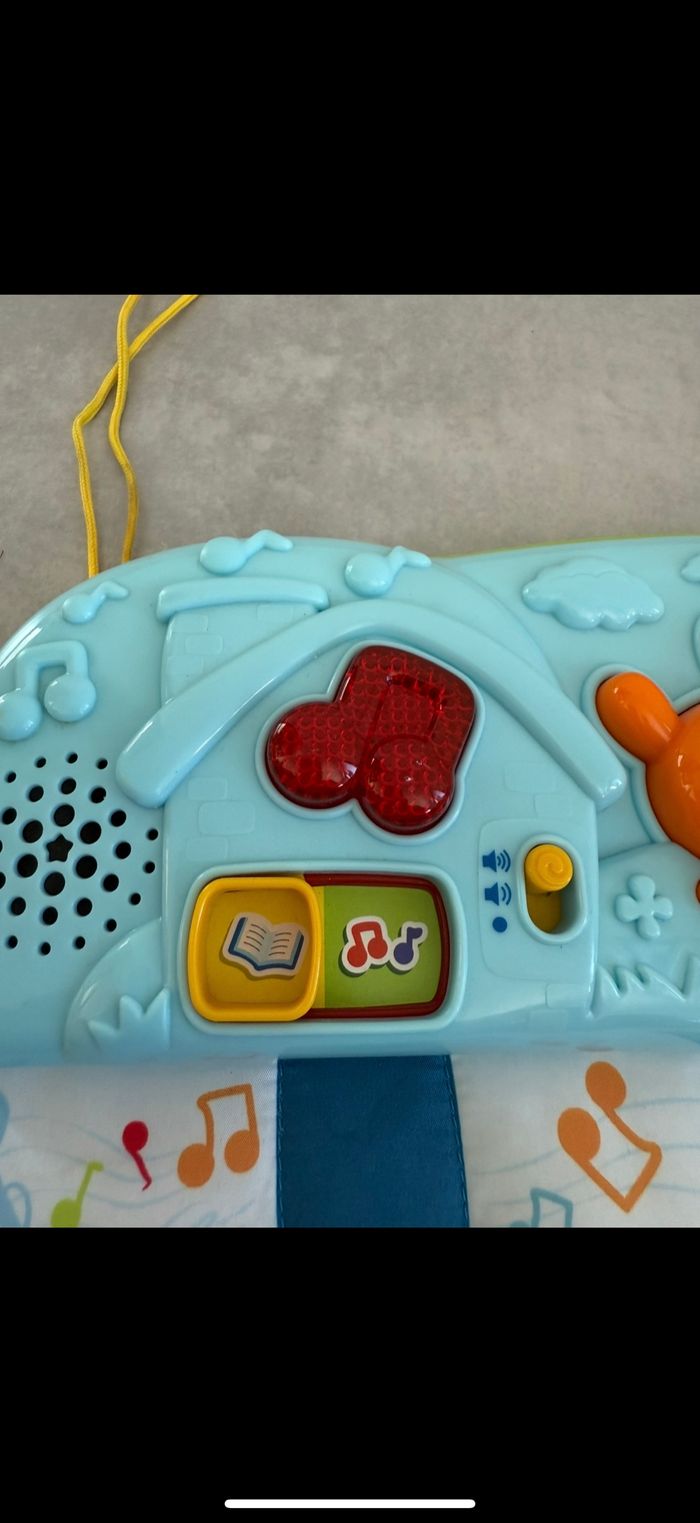 Sonore et lumineux. Plus qu'à appuyer sur les touches. Et à froisser les triangles qui font du bruit. Très coloré pour éveiller les sens. Des lanières pour accrocher aux barreaux du lit ou parc. Pour voiture, poussette... Pleins de jouets première âge. N'hésitez pas à vous abonner et à lire mon profil.😉