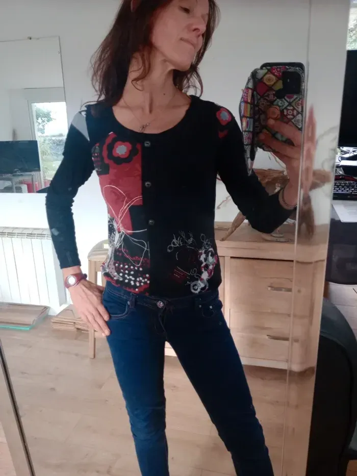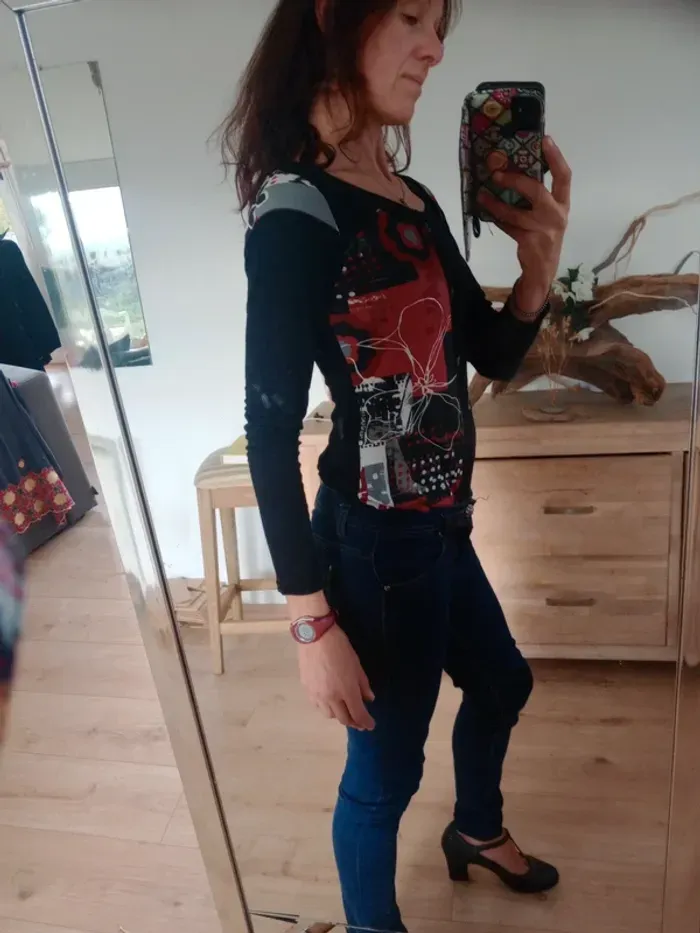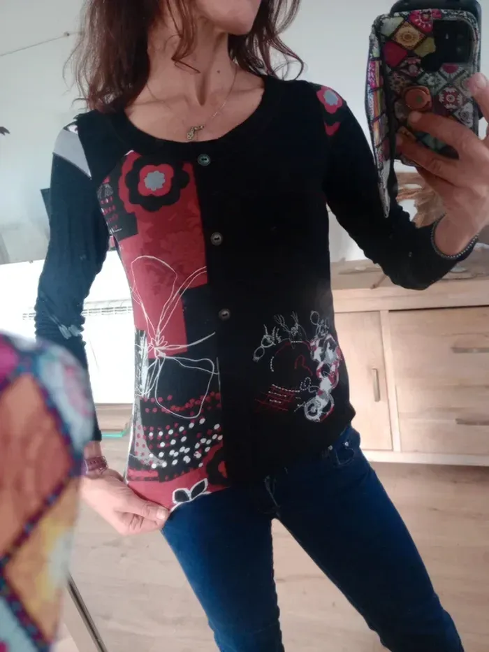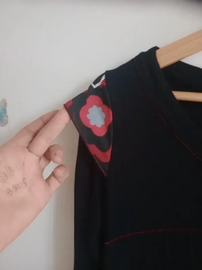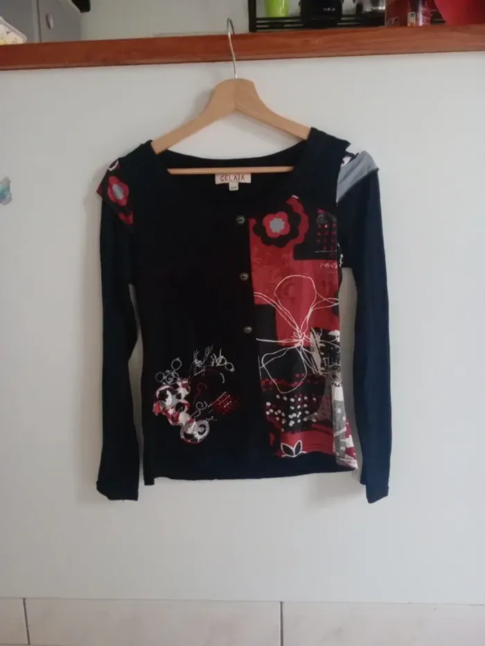 Superbe t-shirt à manches longues, coupe ajustée, col rond Coloris noir avec empiècements rouges et blancs, décoré de jolis motifs floraux et graphiques qui donnent un style original et unique. Motifs brodés dans le bas à droite, présence de trois boutons type métal Très confortable et facile à assortir avec un jean ou une jupe pour un look casual ou bohème chic. ✨ Une pièce originale qui apporte une belle touche de couleur et d’élégance au quotidien. Épaule 40 cm longueur 57 cm Un bouton en plus au niveau de l'étiquette matière #calomomi_femme38