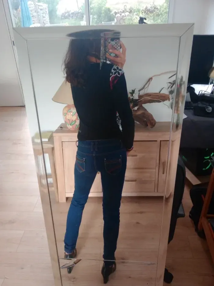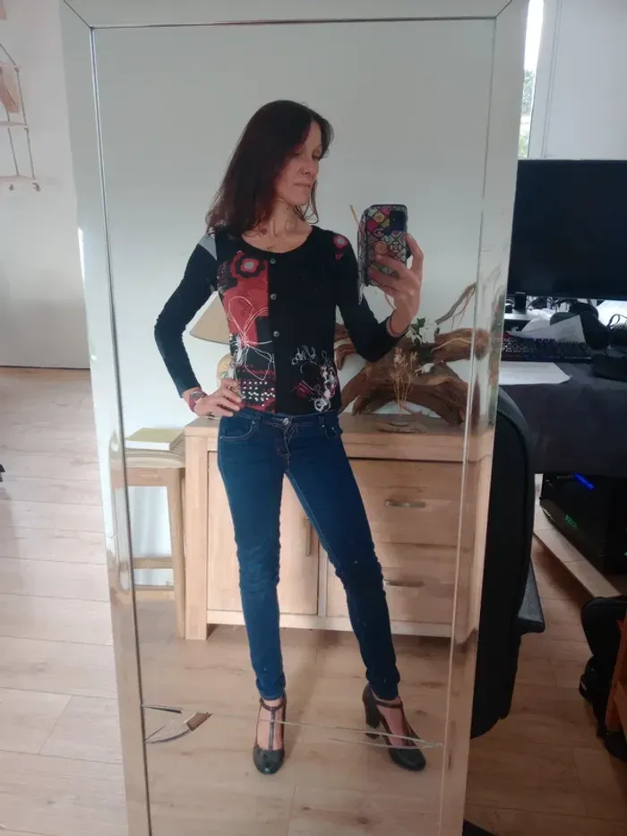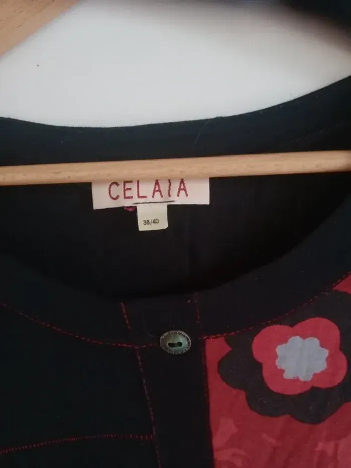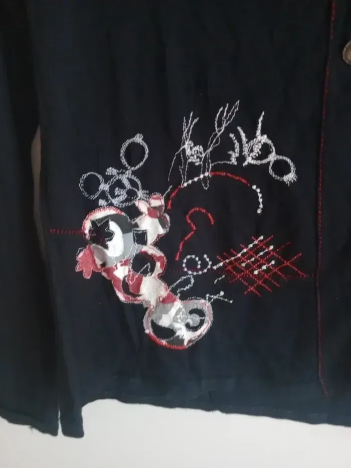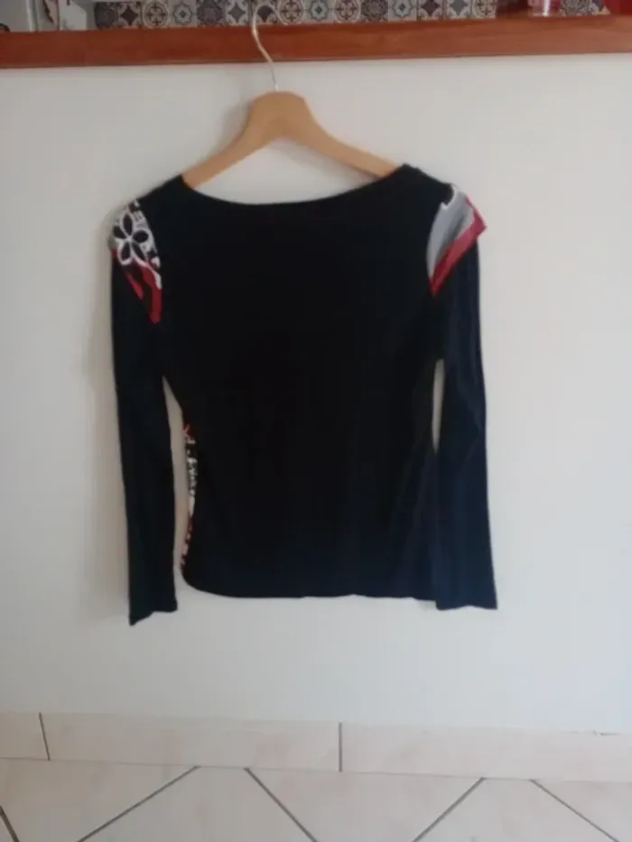 Superbe t-shirt à manches longues, coupe ajustée, col rond Coloris noir avec empiècements rouges et blancs, décoré de jolis motifs floraux et graphiques qui donnent un style original et unique. Motifs brodés dans le bas à droite, présence de trois boutons type métal Très confortable et facile à assortir avec un jean ou une jupe pour un look casual ou bohème chic. ✨ Une pièce originale qui apporte une belle touche de couleur et d’élégance au quotidien. Épaule 40 cm longueur 57 cm Un bouton en plus au niveau de l'étiquette matière #calomomi_femme38