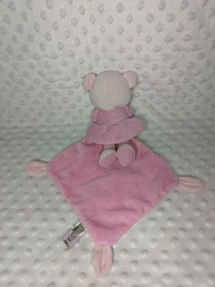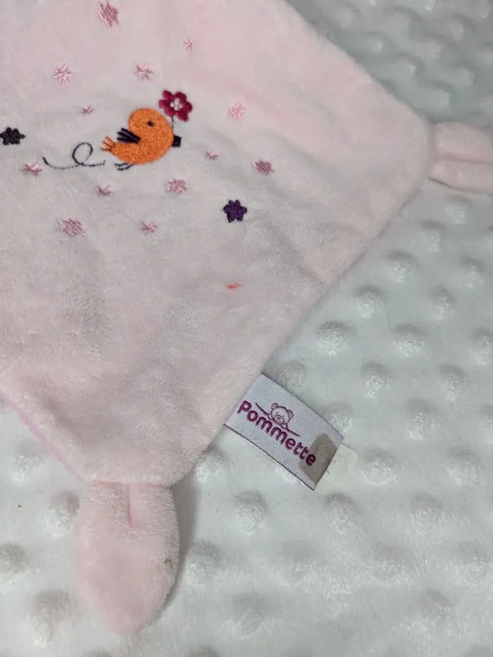Peluche/Doudou Ours rose avec robe - mouchoir oiseau orange et de petites fleurs De la marque Pommette