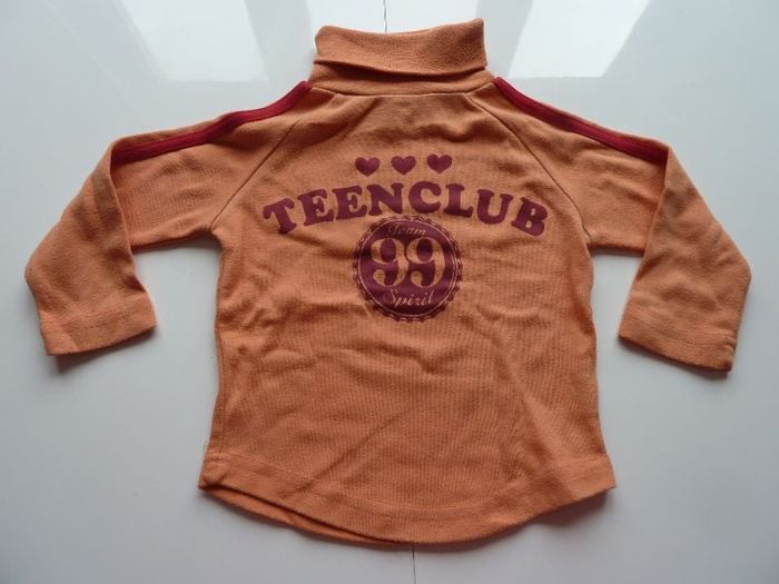 T-SHIRT FILLE 26 MOIS/2 ANS T-shirt, col roulé, orange, inscription rouge TRES BON ETAT !!!