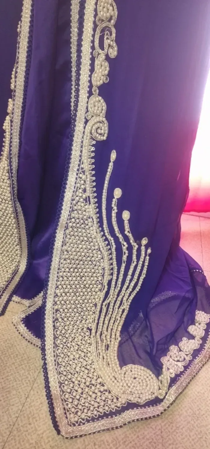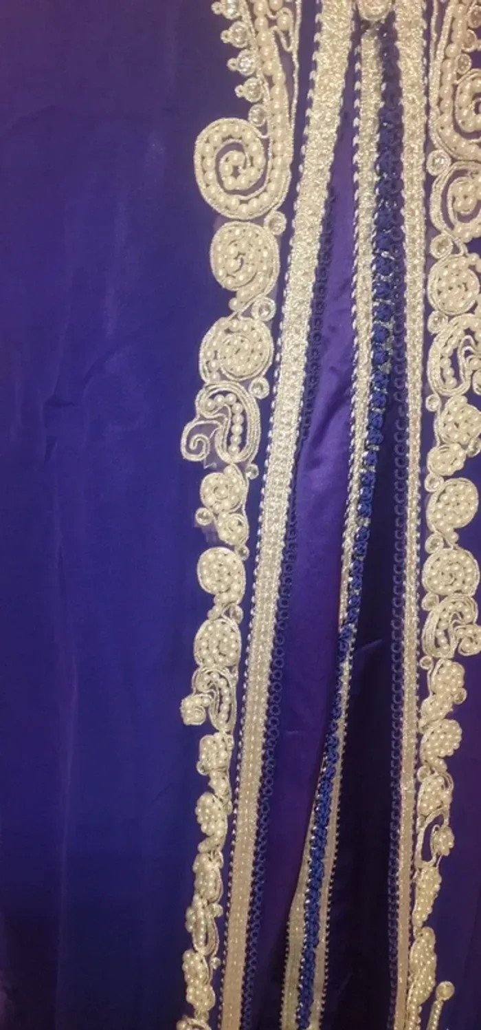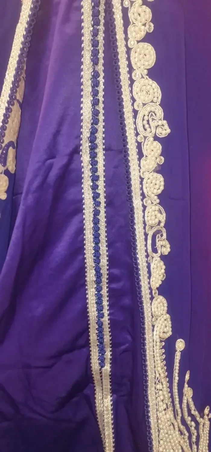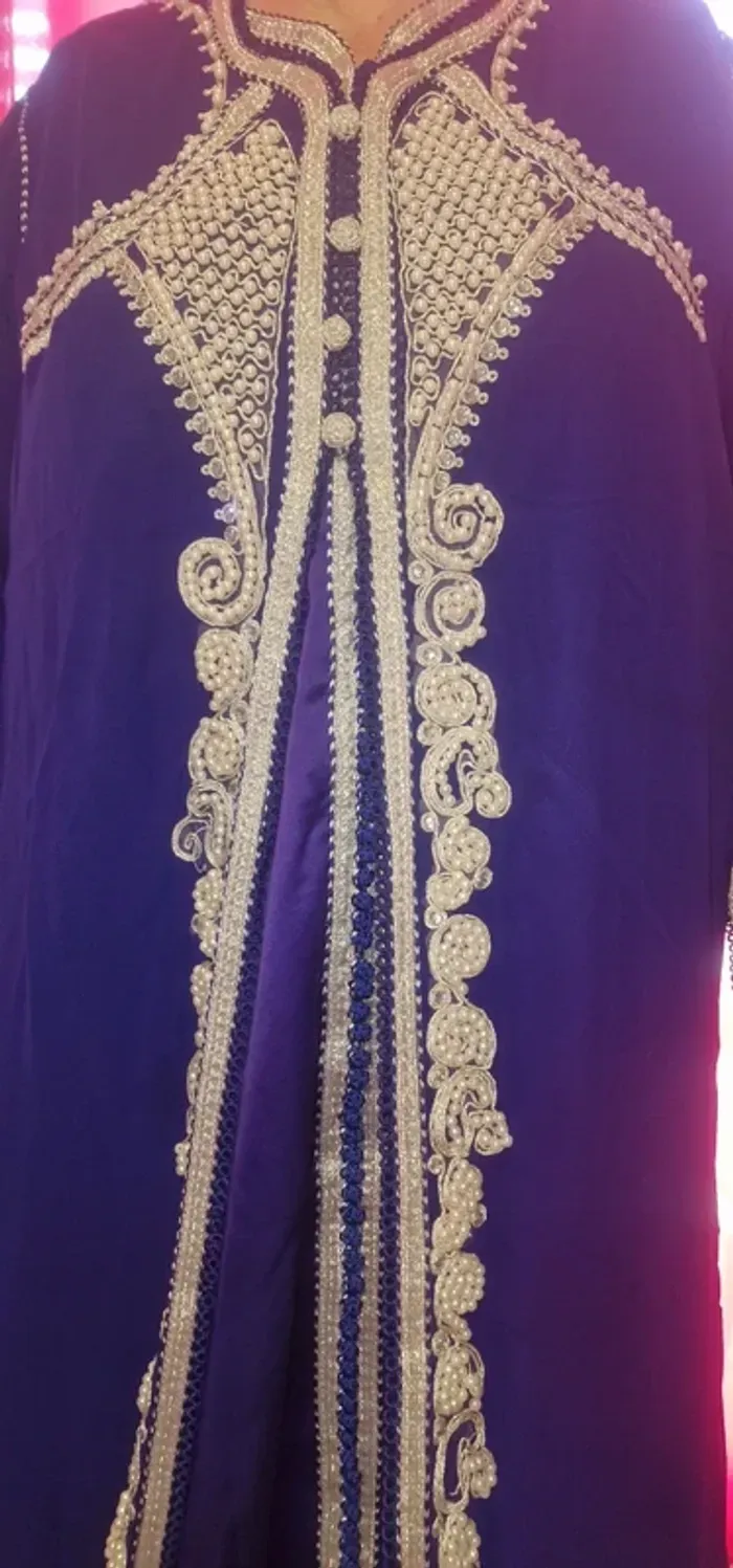 Caftan de pièces de grande taille, il est en tres bon état. Lui manque quelques perles à différents endroits comme vous pouvez voir sur les photos mais il est dans un excellent état. Il y a une ceinture qui va avec mais qui est abîmé son tissus mais on peut mettre la robe avec n'importe quelle autre ceinture. Il peut aller jusqu'à une taille 52 même voir plus. Elle est de couleur violet.