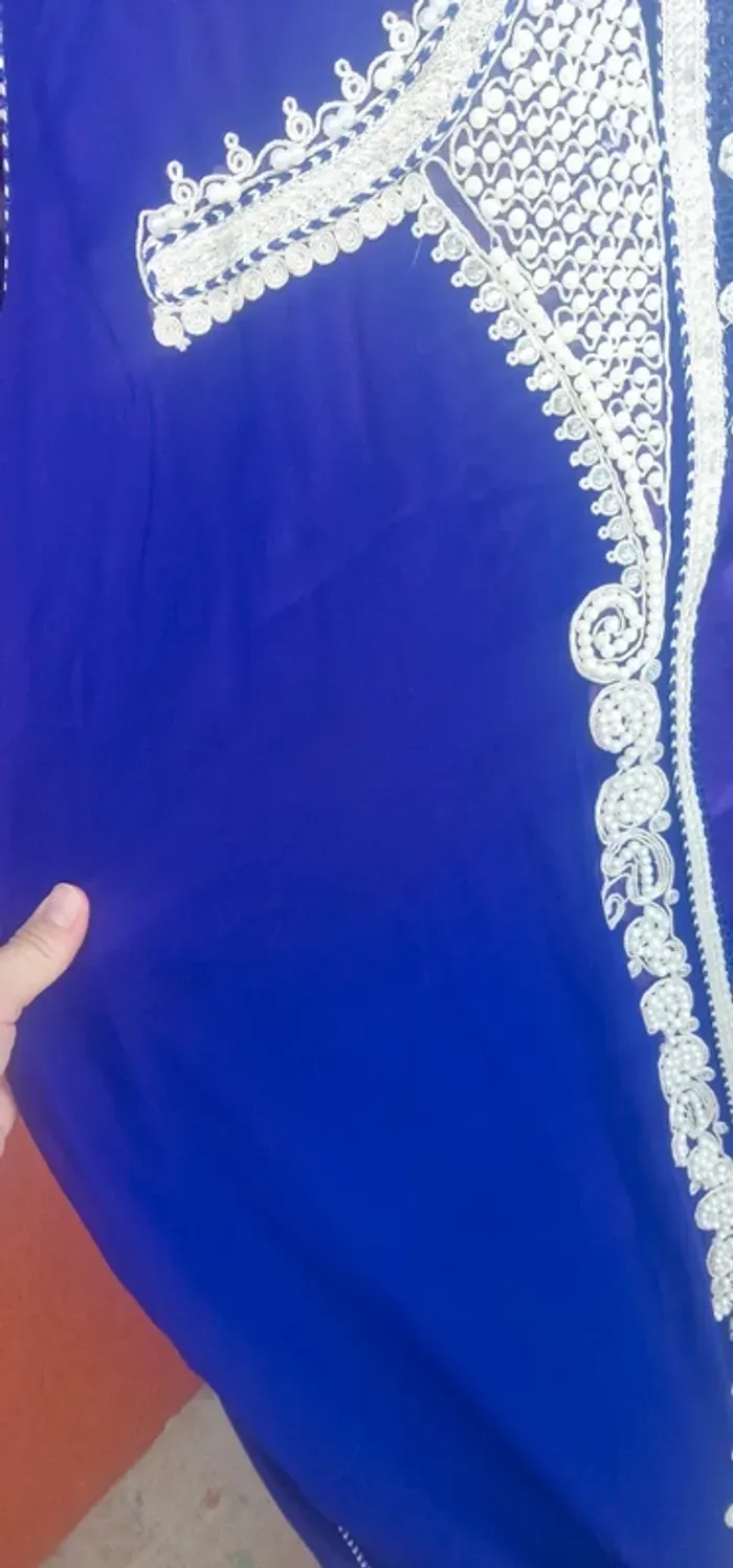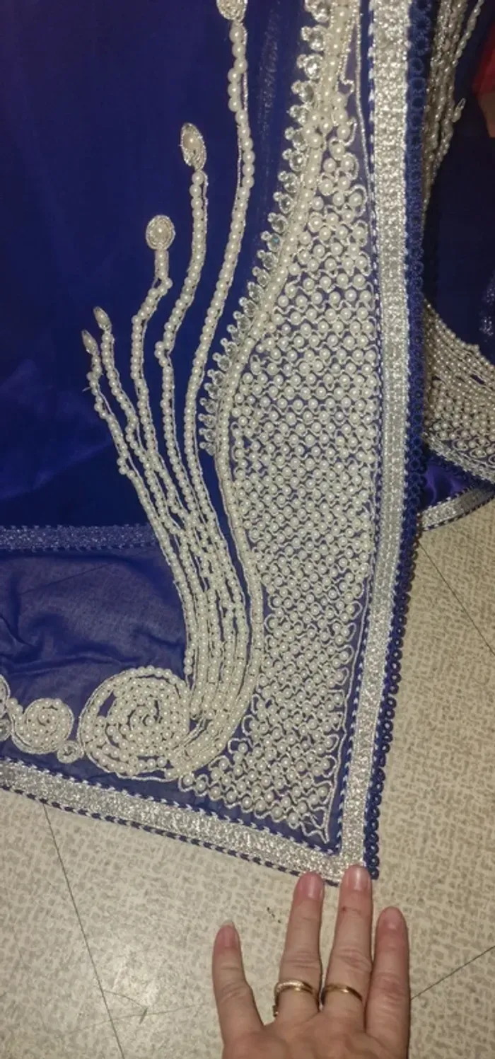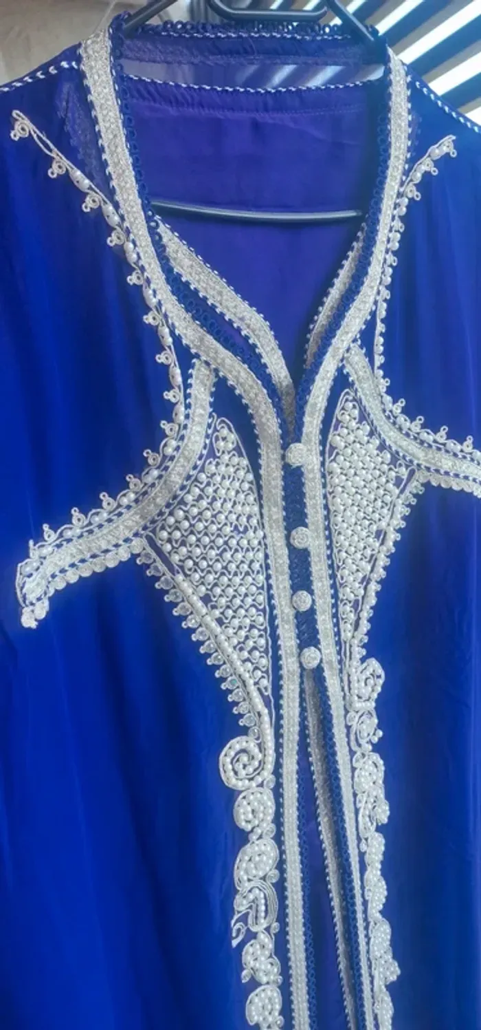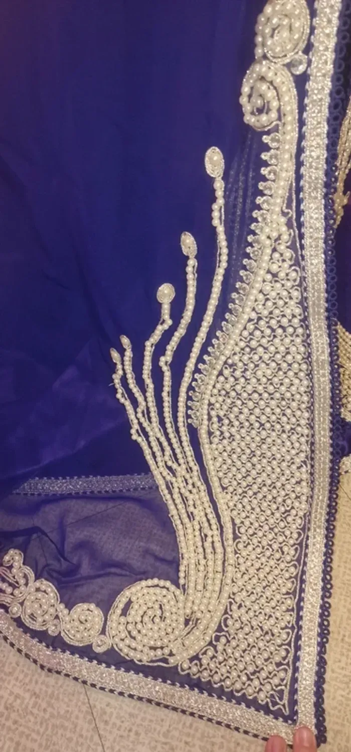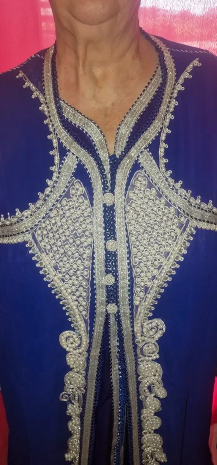 Caftan de pièces de grande taille, il est en tres bon état. Lui manque quelques perles à différents endroits comme vous pouvez voir sur les photos mais il est dans un excellent état. Il y a une ceinture qui va avec mais qui est abîmé son tissus mais on peut mettre la robe avec n'importe quelle autre ceinture. Il peut aller jusqu'à une taille 52 même voir plus. Elle est de couleur violet.