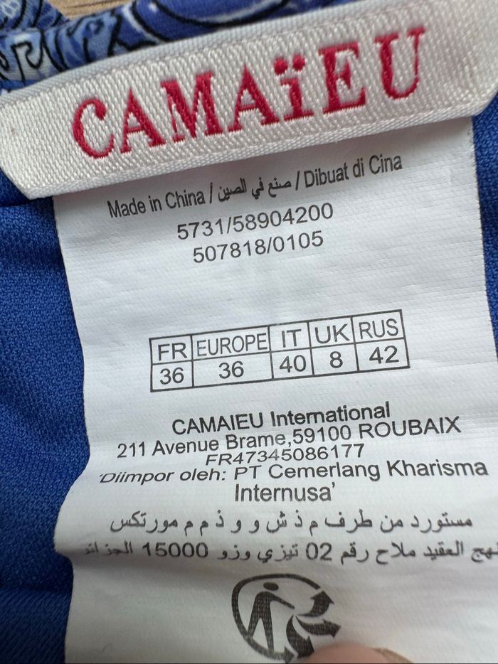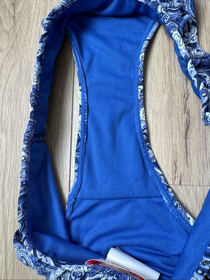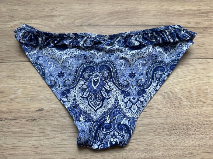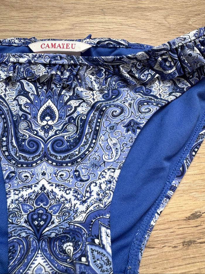 Bas de maillot de bain Camaïeu taille 36 motifs cachemire arabesques bleu et blanc, formes florales stylisées, élégant et bohème avec une touche orientale, volants à la ceinture