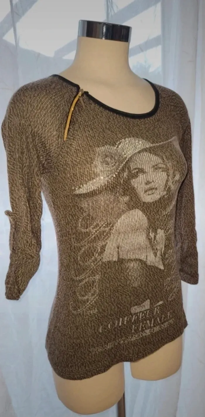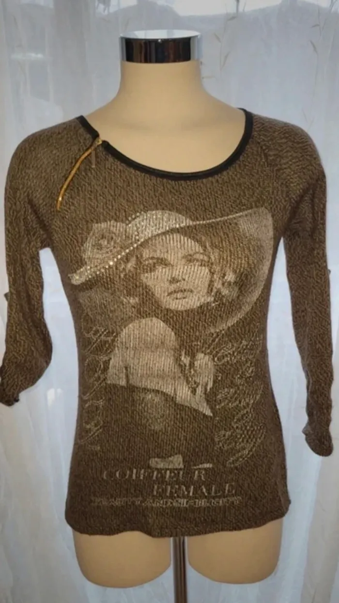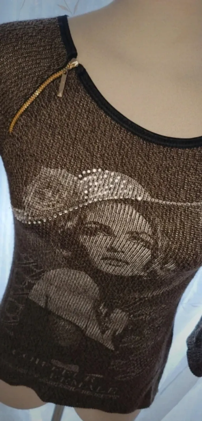 Pull avec possibilité de replié les manches . Donc manches longues ou 3/4. Imprimé portrait femme . Fermeture doré en déco et strass. Plein d'autres vêtements à petits prix, triés par taille #a2life_taille36