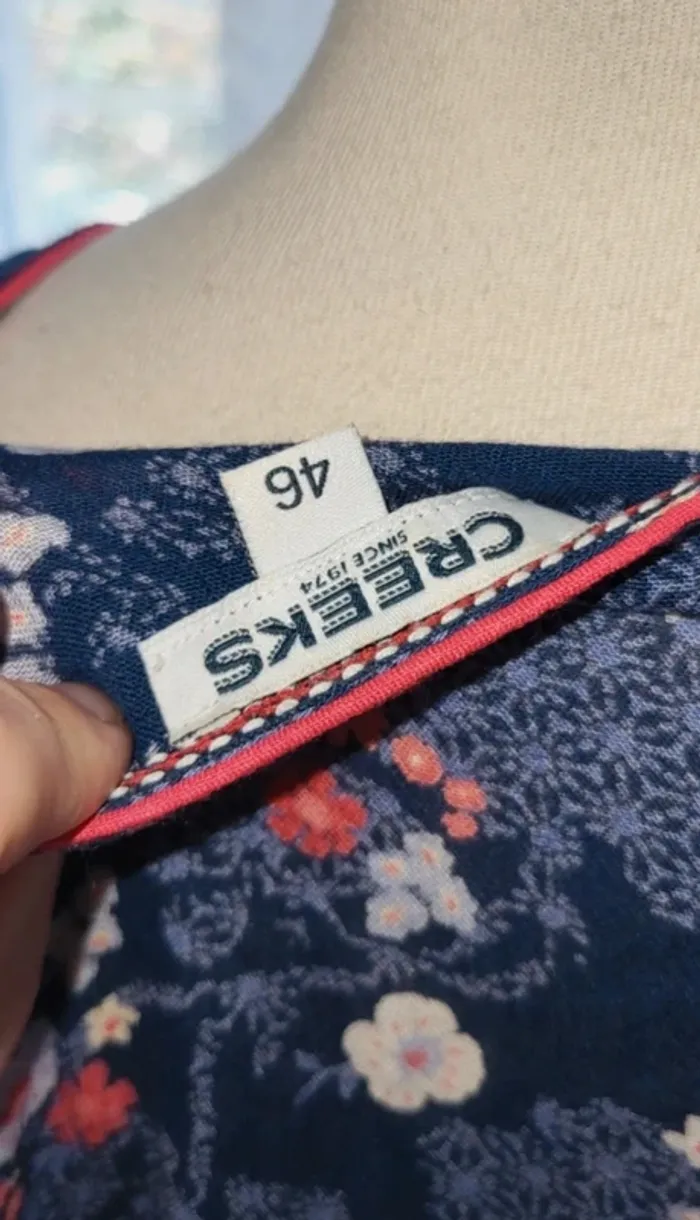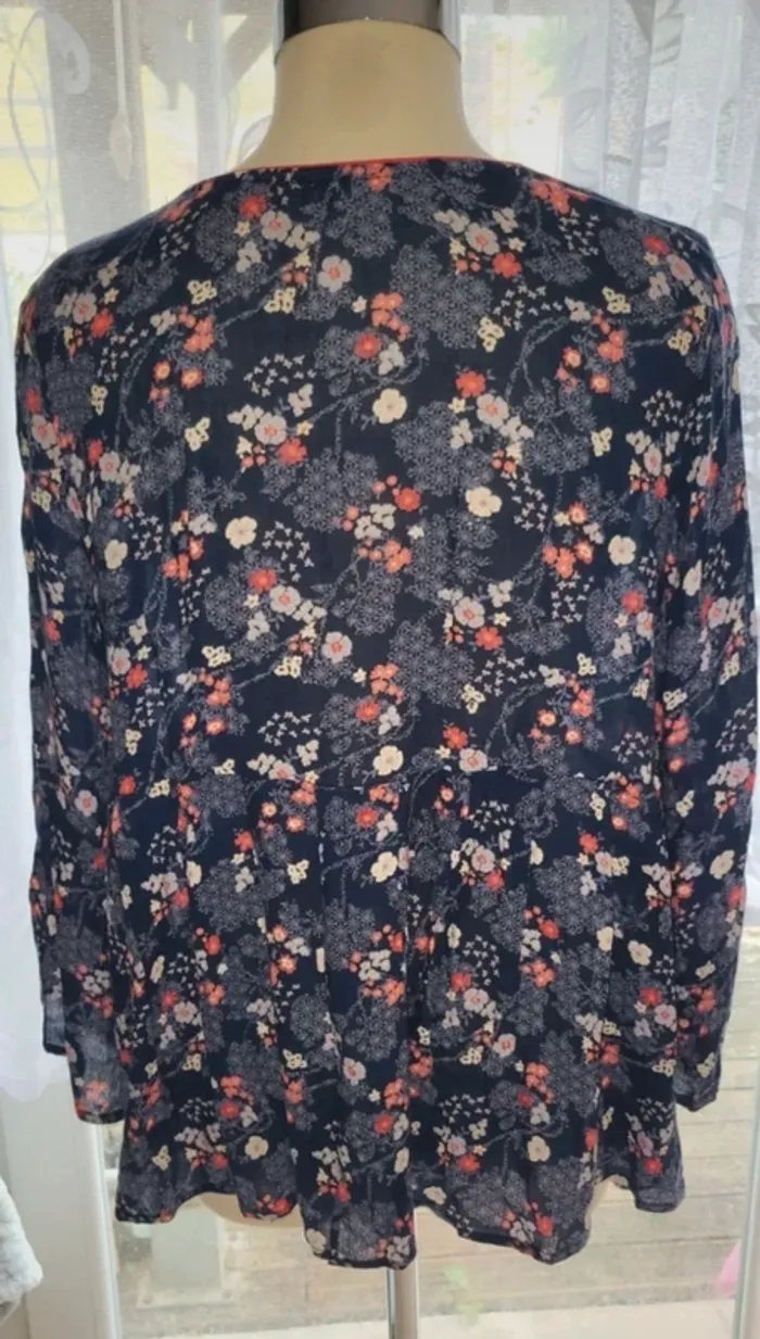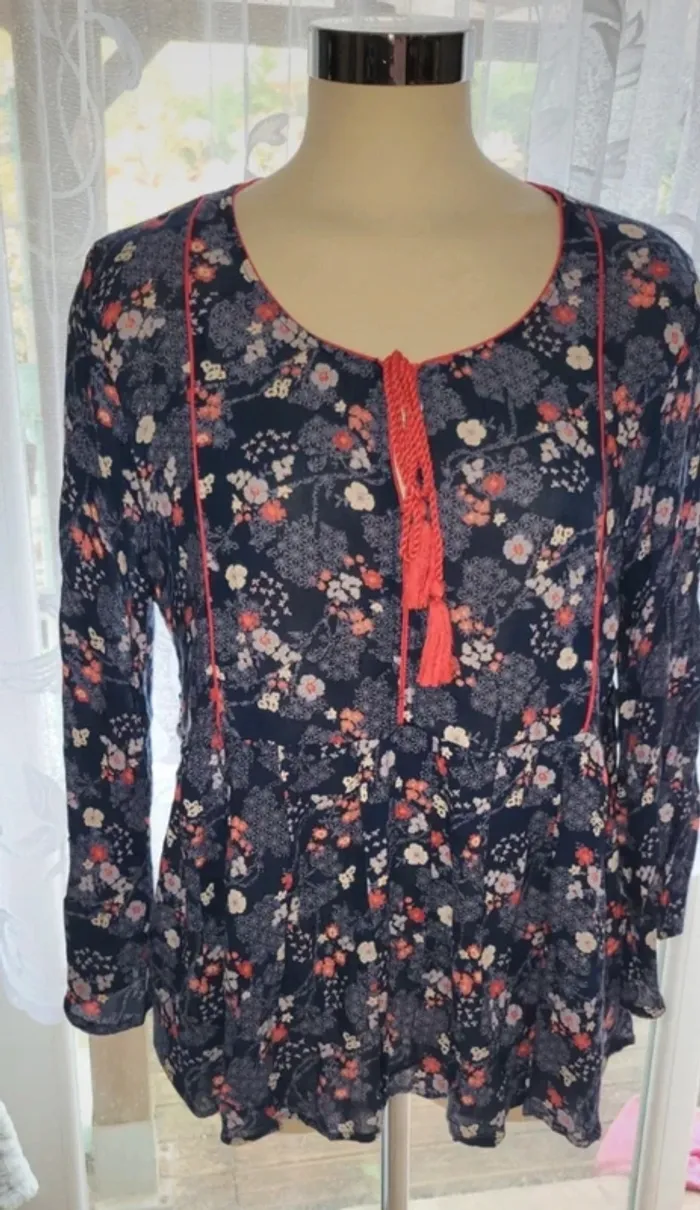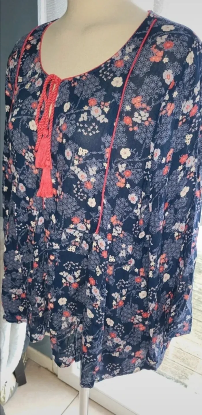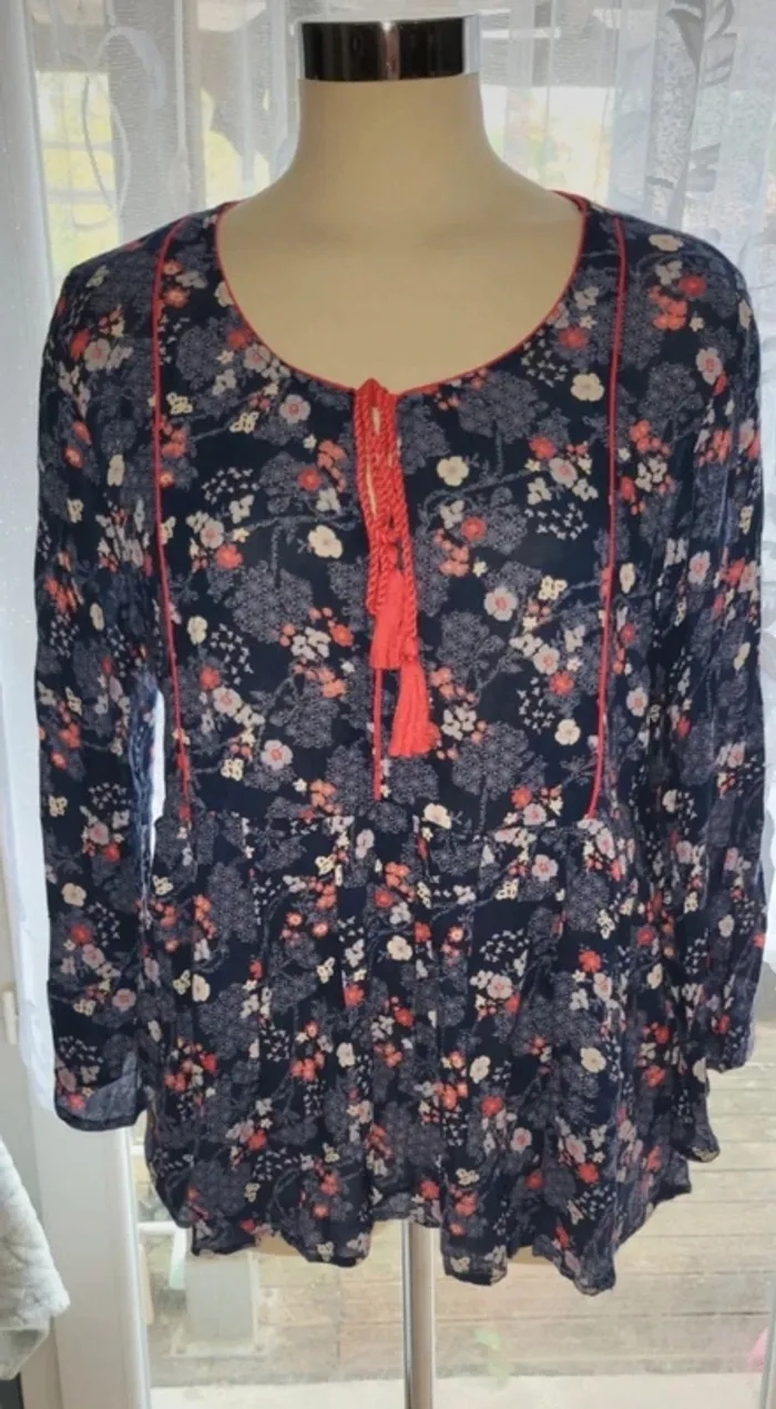 **Description :** Découvrez cette superbe blouse bleu marine ornée d'un motif floral coloré (blanc, rose) et de bordures roses délicates. Avec son cordon rouge à pompons et sa coupe fluide, elle allie confort et élégance. Idéale pour un look décontracté ou chic selon vos envies. 📏 **Taille :** 46 ✨ **État :** Très bon état Pleins d'autres vêtements à petits prix #a2life_taille46