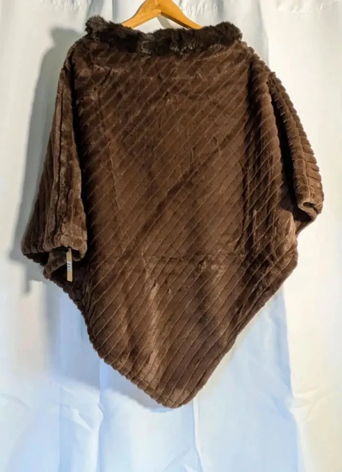Ce poncho tout doux est élégant et pratique Taille unique Largeur cou 35 cm environ Longueur 88 cm environ Largeur 104 cm environ Longueur du cou à la manche 46 cm environ 100% polyester Marron #ponchohivers #ponchofemme #capefemme #cape