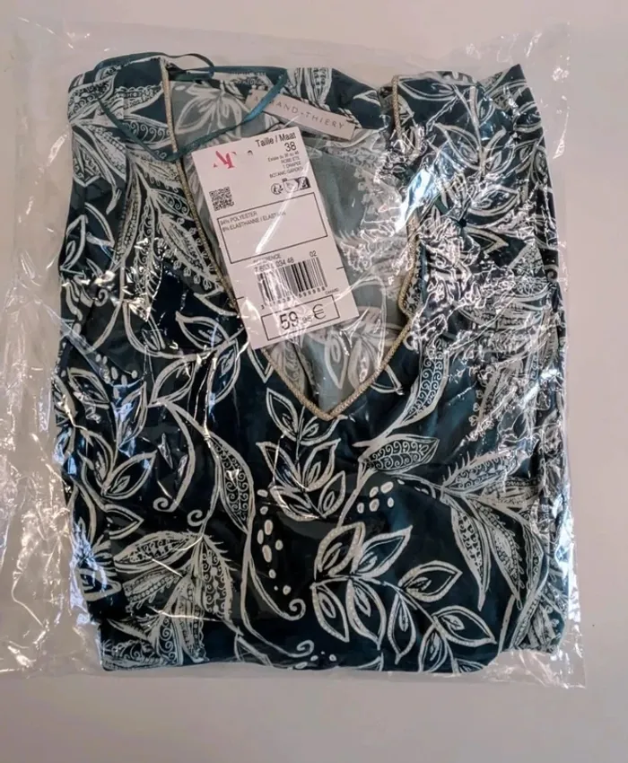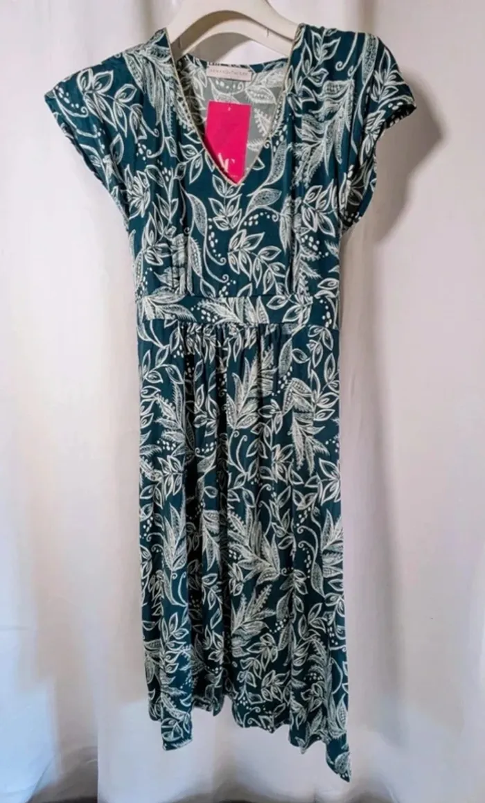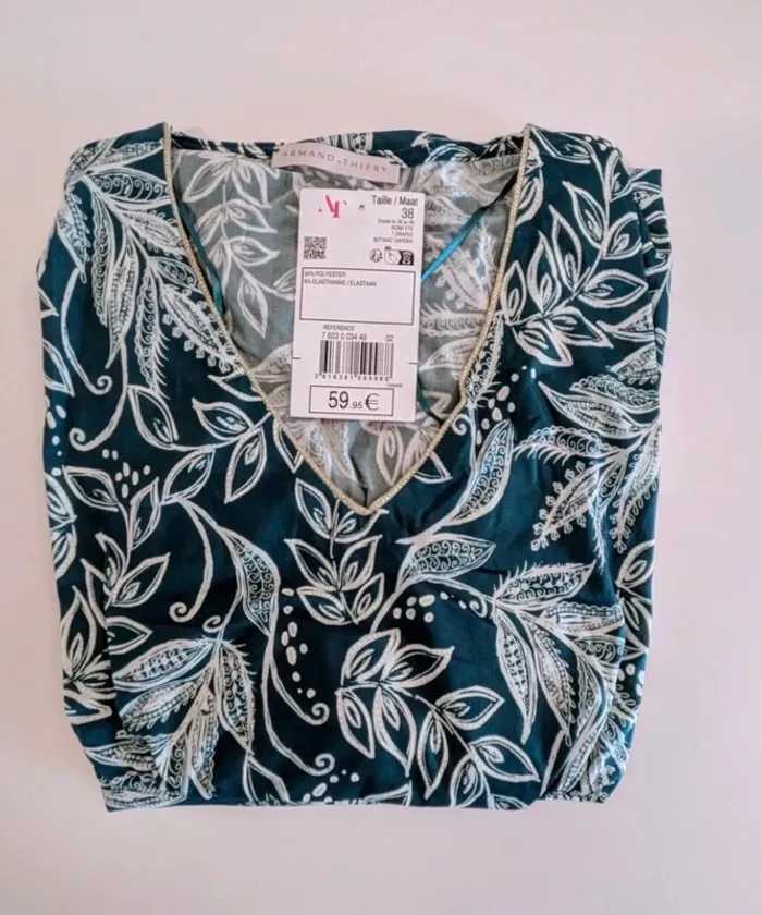 Robe en maille imprimé feuillage à manches courtes et col V. Coupe évasée façon empire cintrée sous la poitrine. Longueur 98 cm. Manches courtes. Col V. Imprimé feuillage et pointillés en relief. Motifs monochromes sur fond contrastant. *Tissu en maille extensible. Encolure avec liseré métallisé devant. Ceinture cousue à nouer au dos. Fines fronces sous la poitrine Taille 38 (autre taille sur disponible) Marque Armand Thiery 96% polyester 6% Elasthanne