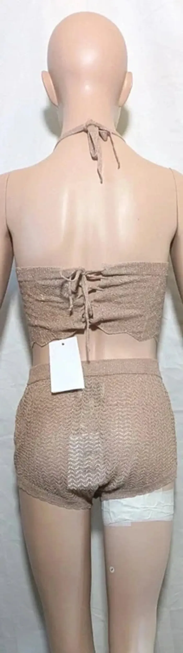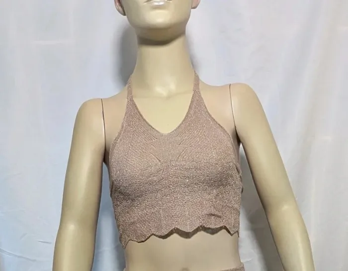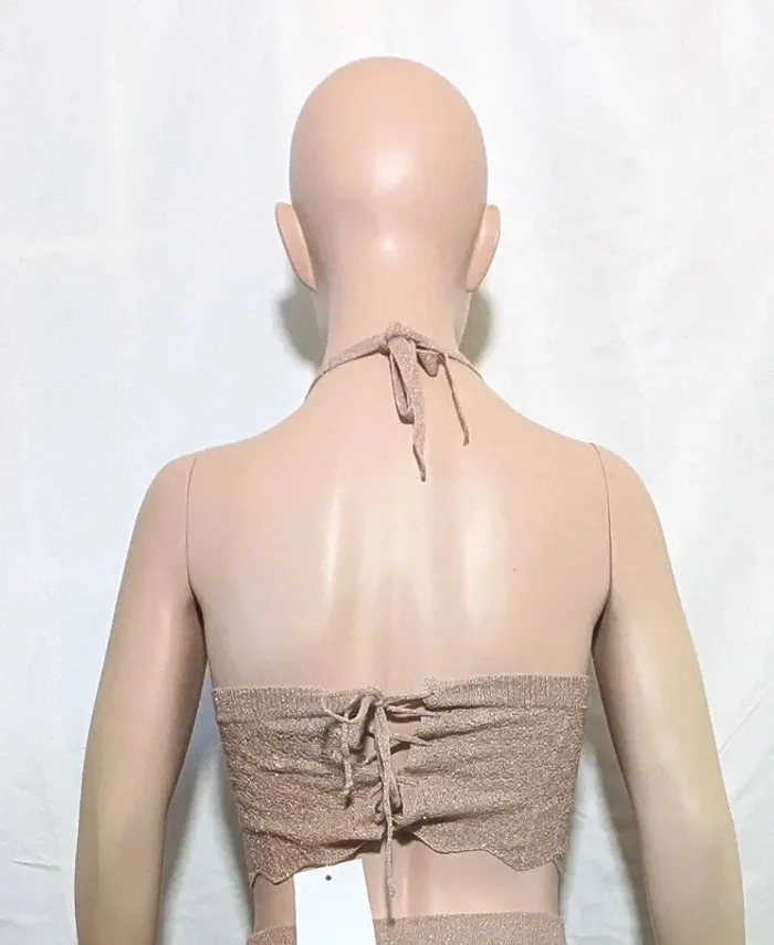 Top court en maille mélangée corail. Maille ajourée. Jeux de rayures et de dessins dans la matière. Dos nu avec liens à nouer dans le cou.