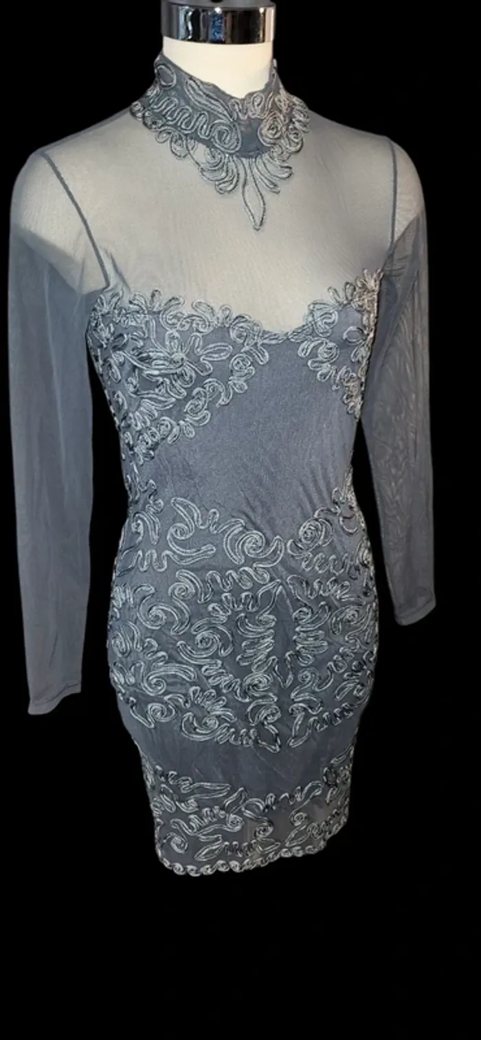 Description : Sublime robe longue à manches longues, en tissu transparent gris foncé avec broderies argentées florales et arabesques. Détail raffiné au niveau du col et du buste, avec une coupe flatteuse et féminine. Portée une seule fois, état impeccable. Convient pour une taille 36/38, idéale pour mariage, gala ou événement chic. Tissu léger et agréable grâce à son élasticité. Étiquette coupée. #a2life_taille36 ##a2life_taille38 #robeélégante #robebrodée #modefemme #looksoirée #tenuechic #vintedfrance #vintedaddict #fashionaddict #robeunique #vintedstyle #occasion #vintedlook #vintedfind #tenuedemariage #robeformelle #vintedluxe