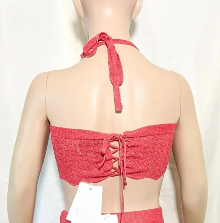 Top court en maille mélangée corail. Maille ajourée. Jeux de rayures et de dessins dans la matière. Dos nu avec liens à nouer dans le cou.