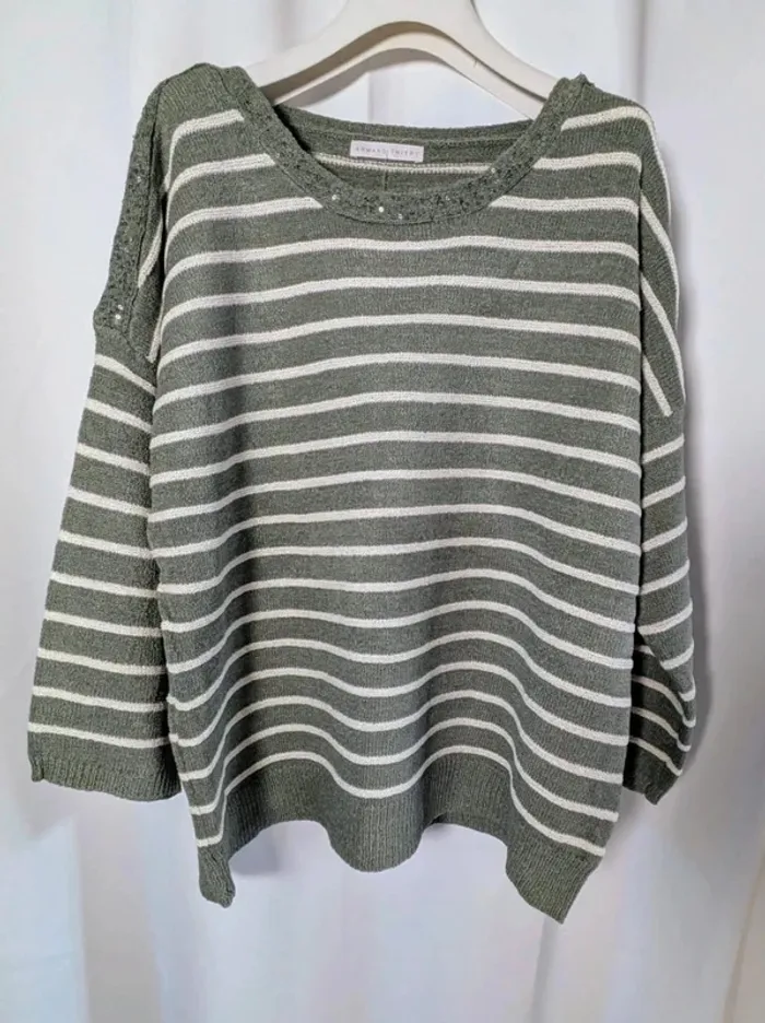 Pull rayé à manches 3/4 avec sequins à l'avant du col et aux épaules. Coupe droite. Manches 3/4. Emmanchures tombantes. Petit col bateau. Rayures bicolores avec reflets métallisés. Effet relief grâce au contraste du tricot en maille jersey et point mousse. Poignets et base en côtes. Sequins ton sur ton en finition du col devant et des bandes sur les épaules. Tissu principal : ACRYLIQUE 47% , POLYAMIDE 41% , POLYESTER 11% , FIBRE METALLIQUE 1% Marque : Armand thiery Taille : 5