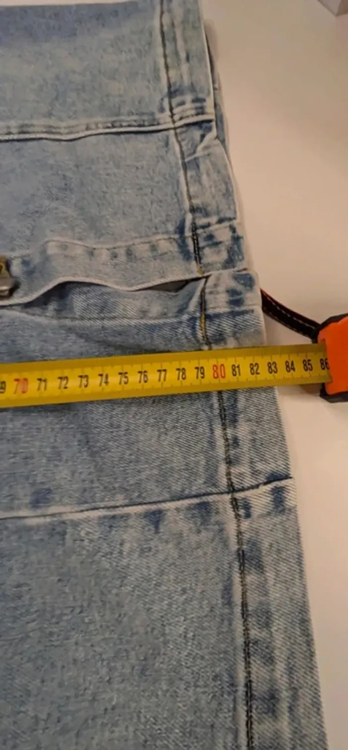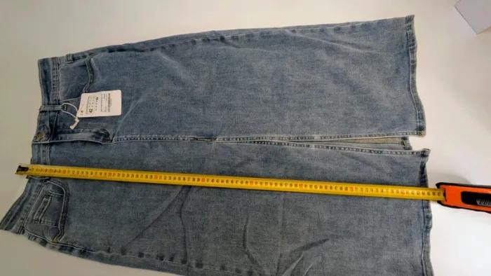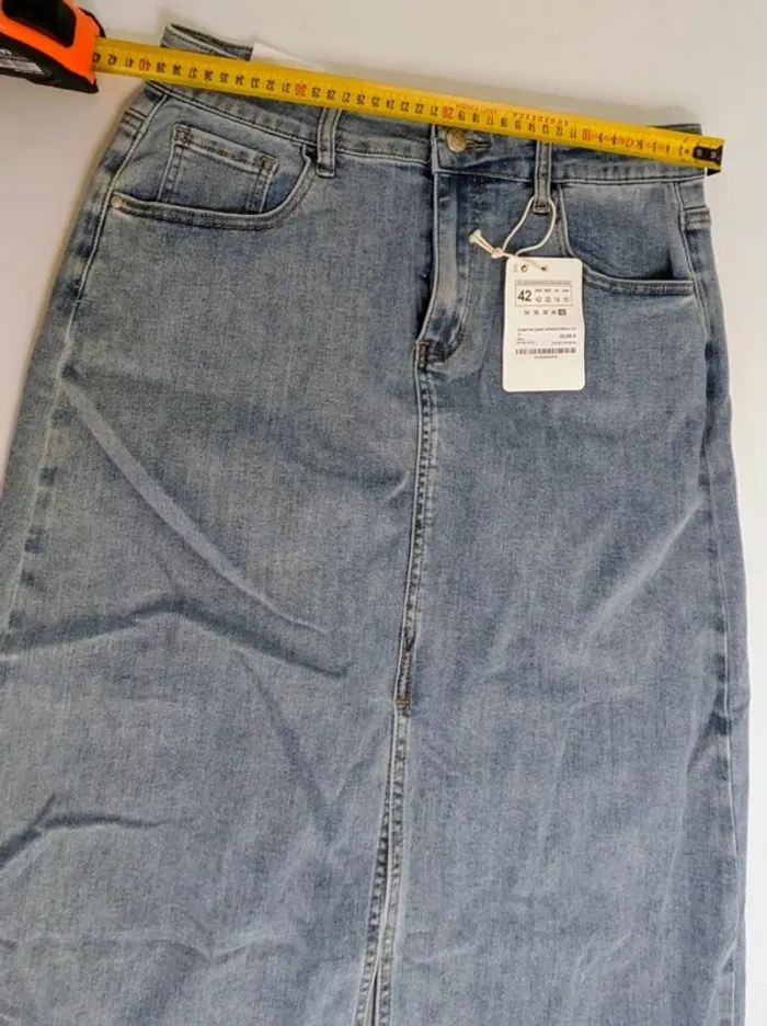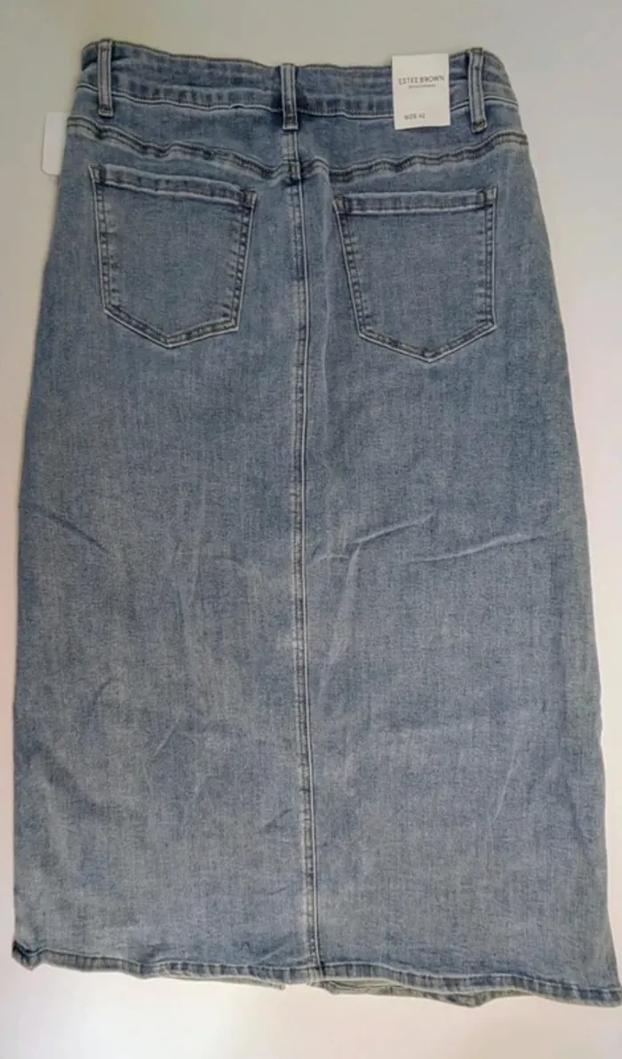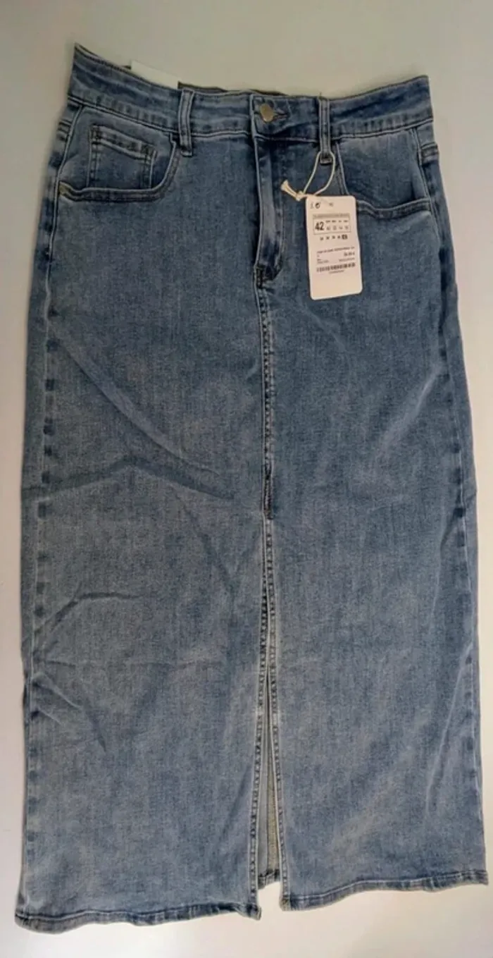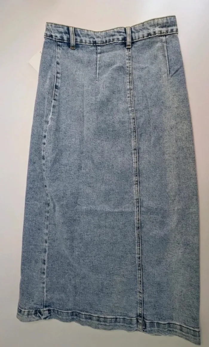 Jupe longue en jean fendue à l’avant avec fermeture éclair et bouton ainsi que des ardillons pour ceinture. Trois poches à l’avant et deux poches à l’arrière.