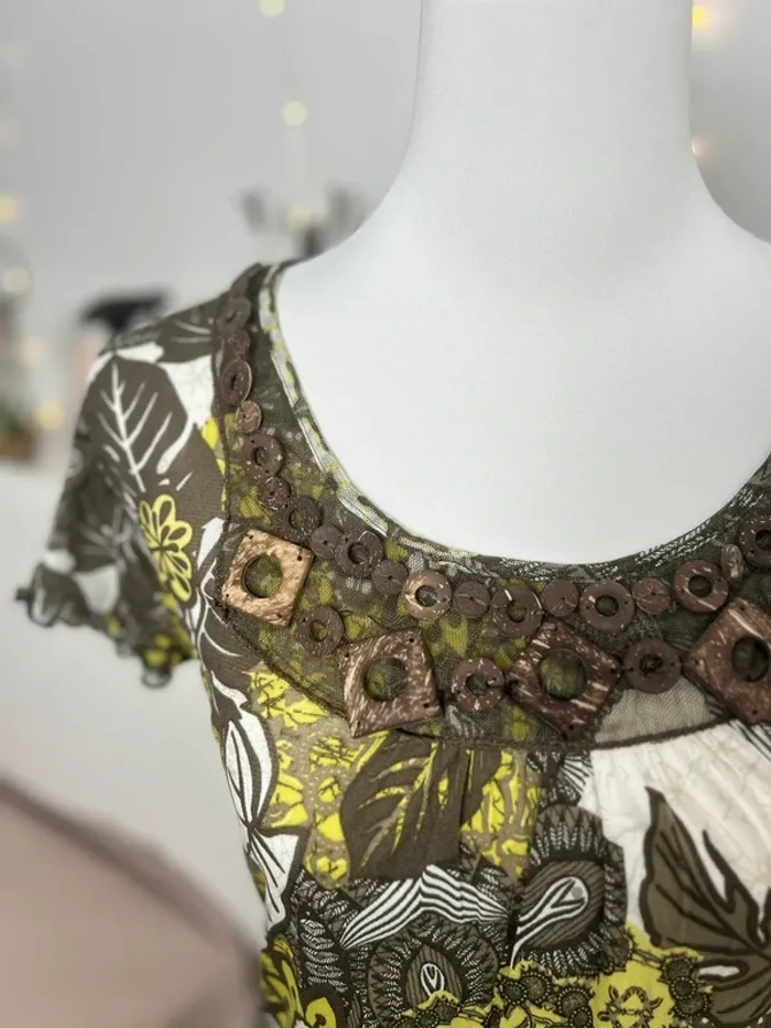 haut vert et marron vintage perlé à motifs fleuris taille L