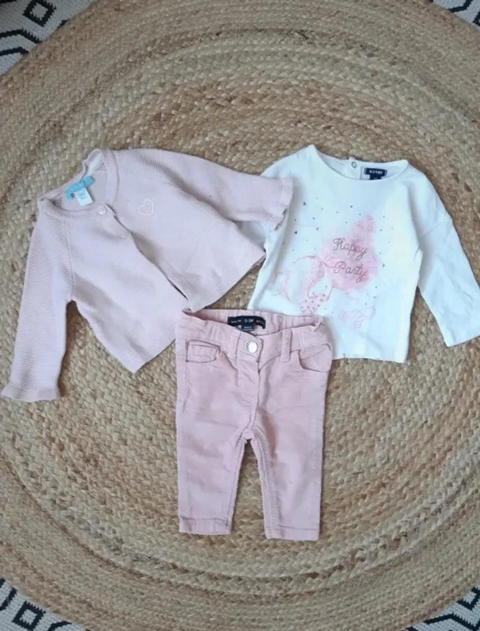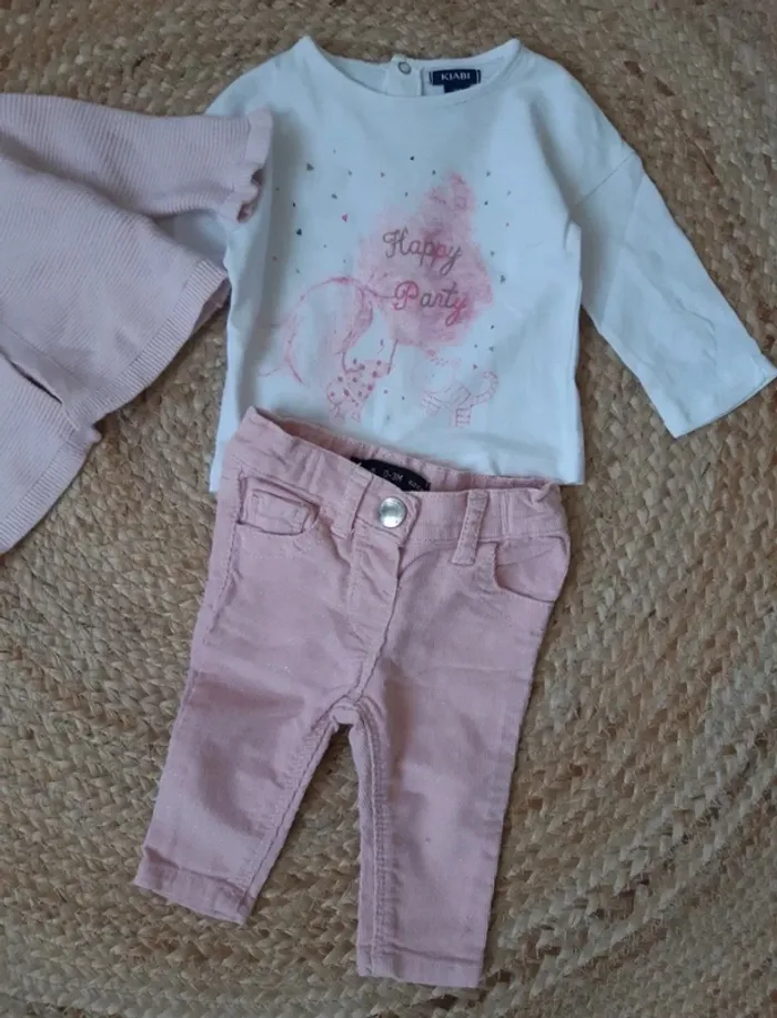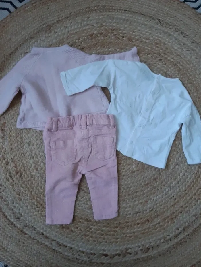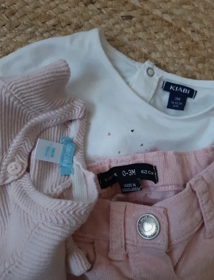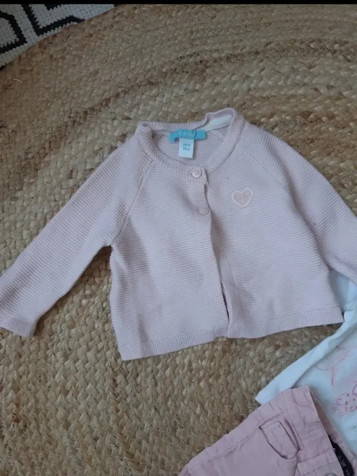 Gilet en maille rose coeur Obaïbi 3 mois Tee-shirt manches longues Kiabi 3 mois Pantalon côtelé pailleté Baby Girl 62 cm #anthonyagnes_bebe3M
