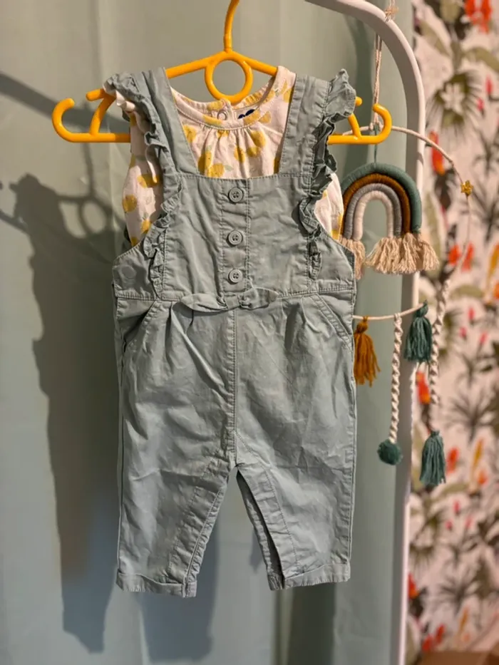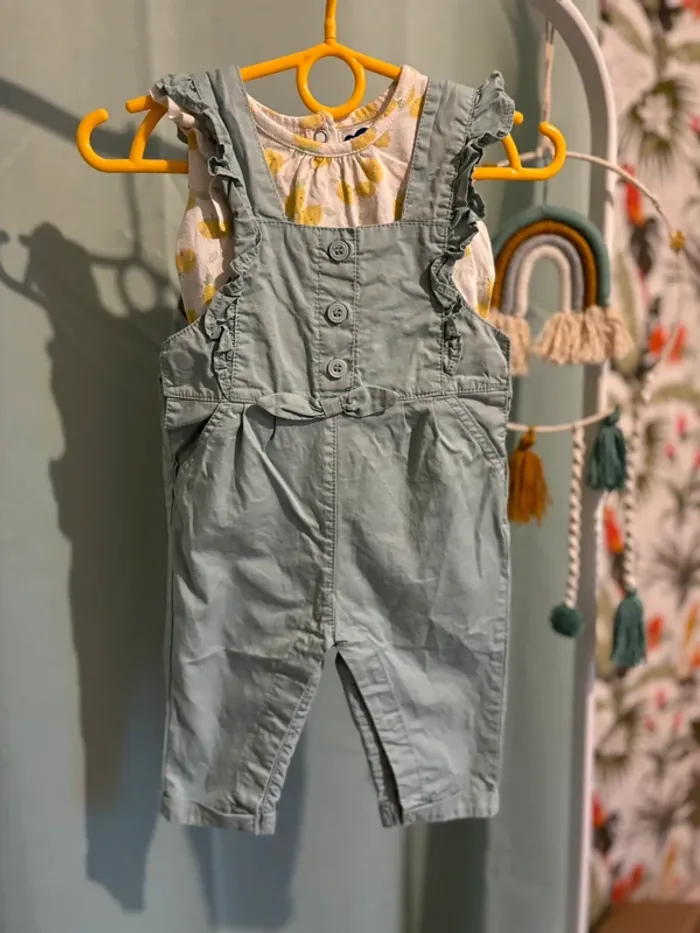 Ensemble salopette + t-shirt Vert d’eau et jaune citron Taille 6 mois