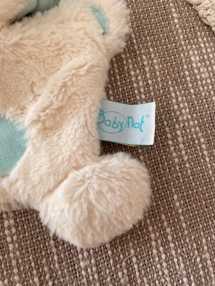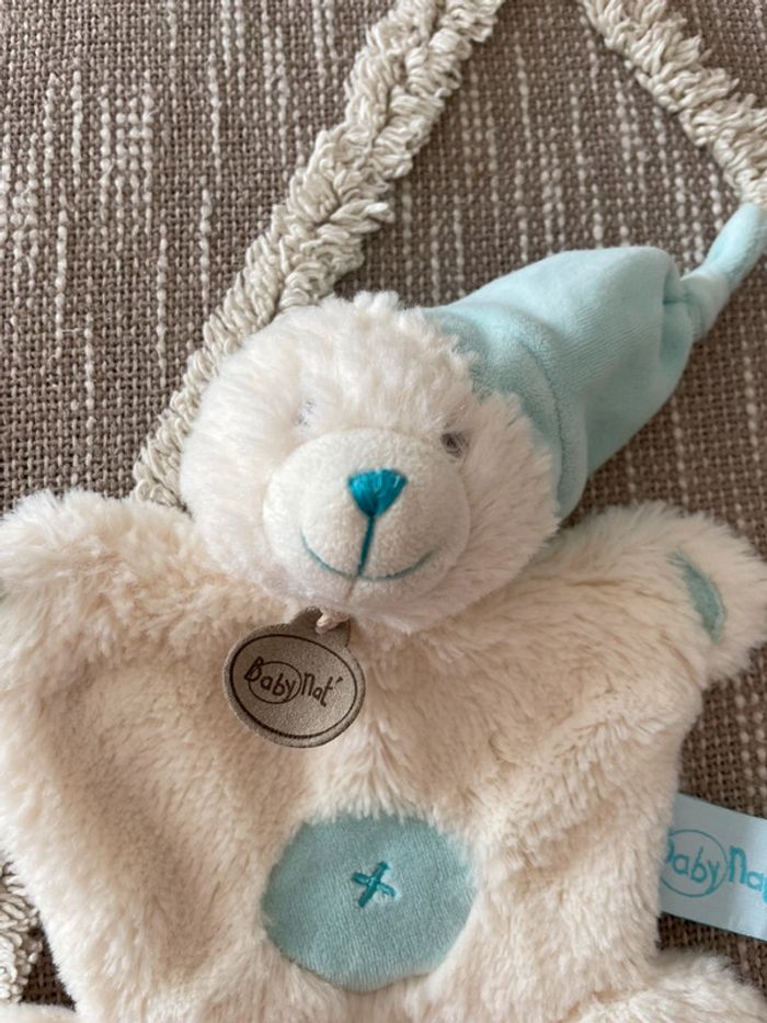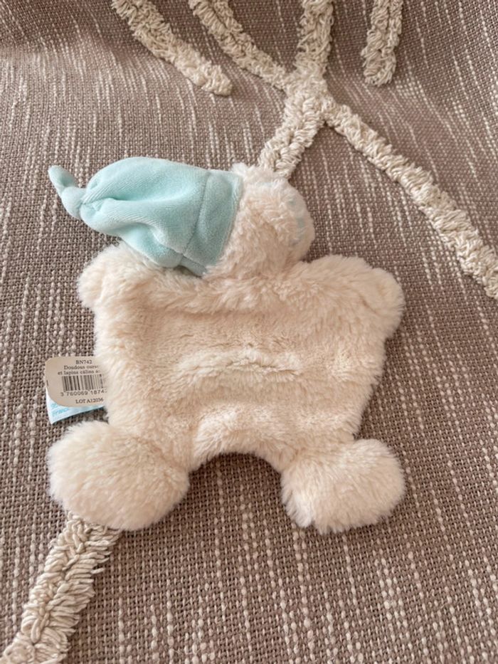 Peluche doudou plat 20cm Babynat ours blanc crème et bonnet bleu très bon état - photo numéro 4