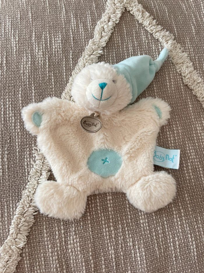 Peluche doudou plat 20cm Babynat ours blanc crème et bonnet bleu très bon état - photo numéro 1