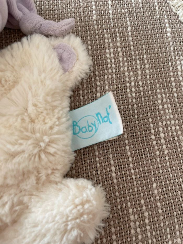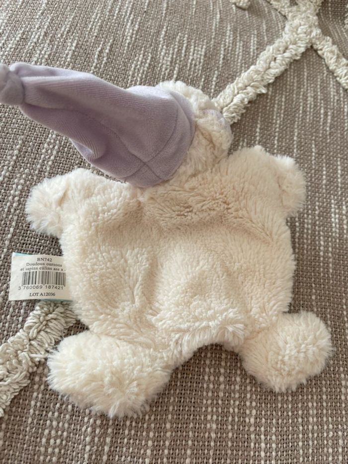 Peluche doudou plat 20cm Babynat ours blanc crème et bonnet violet très bon état - photo numéro 4