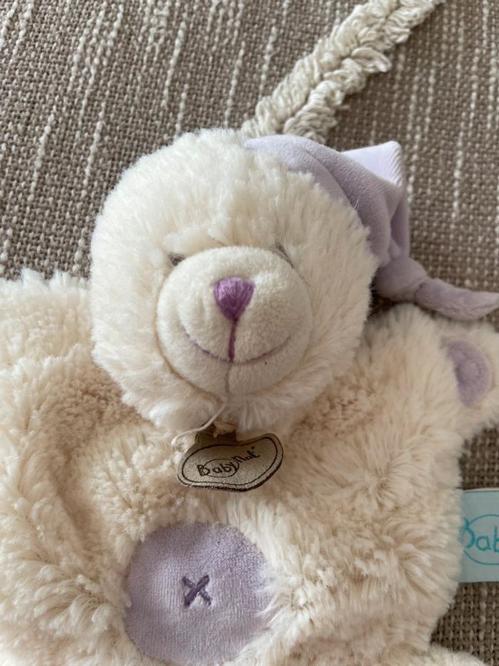 Peluche doudou plat 20cm Babynat ours blanc crème et bonnet violet très bon état - photo numéro 1