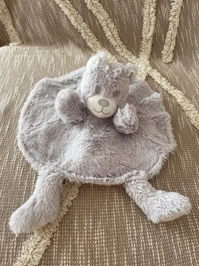 Peluche doudou plat 27cm Tom et Zoé ours rond gris et blanc poils long parfait état - photo numéro 1
