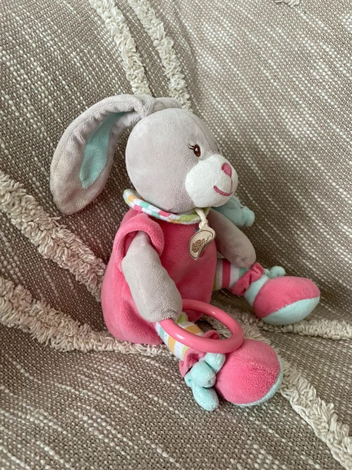Peluche doudou d‘éveil 25cm Babynat lapin gris rose et bleu très bon état - photo numéro 1
