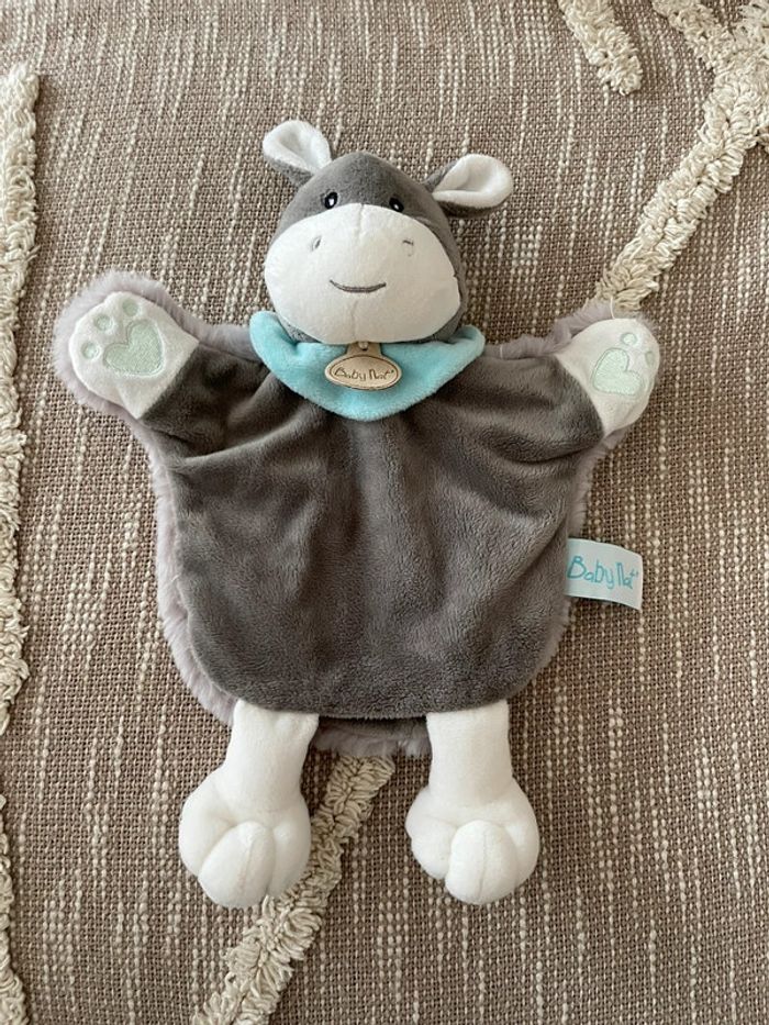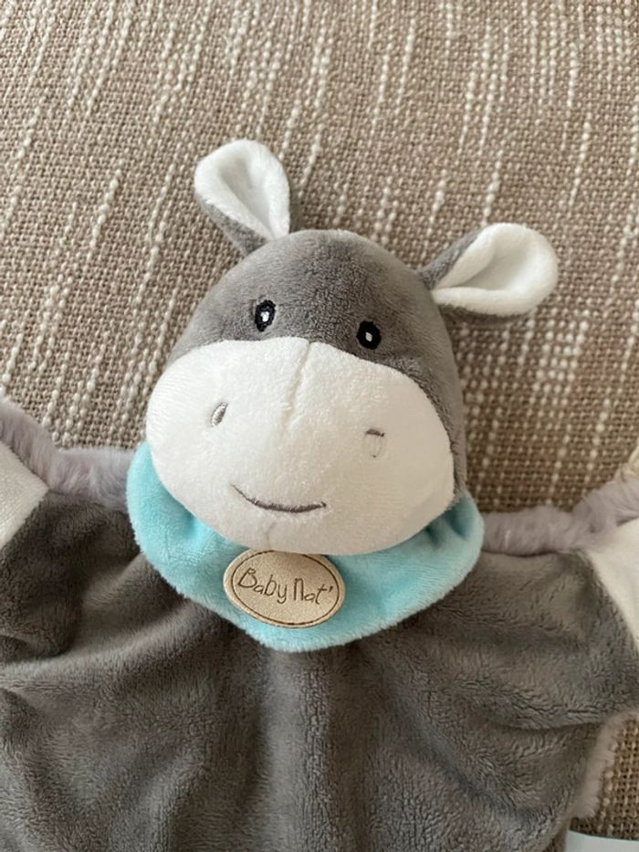 Peluche doudou marionnette 30cm Babynat âne gris blanc et bleu parfait état - photo numéro 1