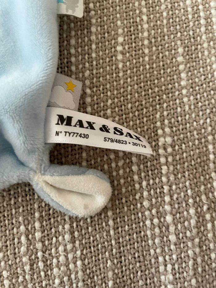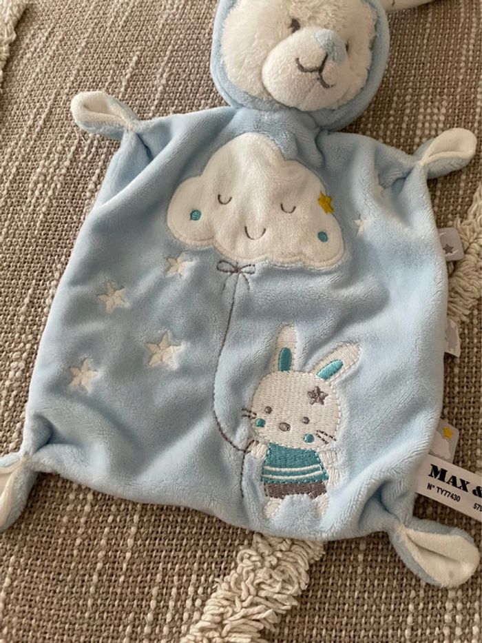Peluche doudou plat max and sax ours bleu et blanc très bon état - photo numéro 1