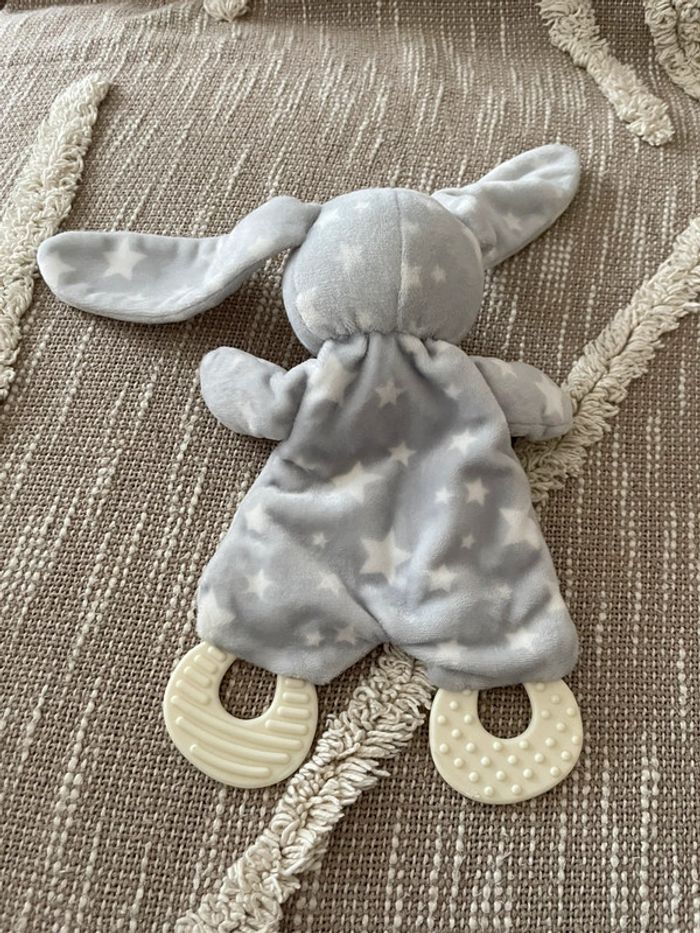 Peluche doudou plat d’éveil 20cm action lapin blanc et gris à pois très bon état - photo numéro 1