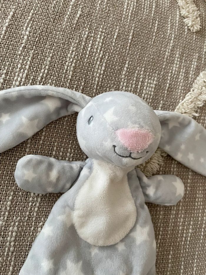 Peluche doudou plat d’éveil 20cm action lapin blanc et gris à pois très bon état - photo numéro 2