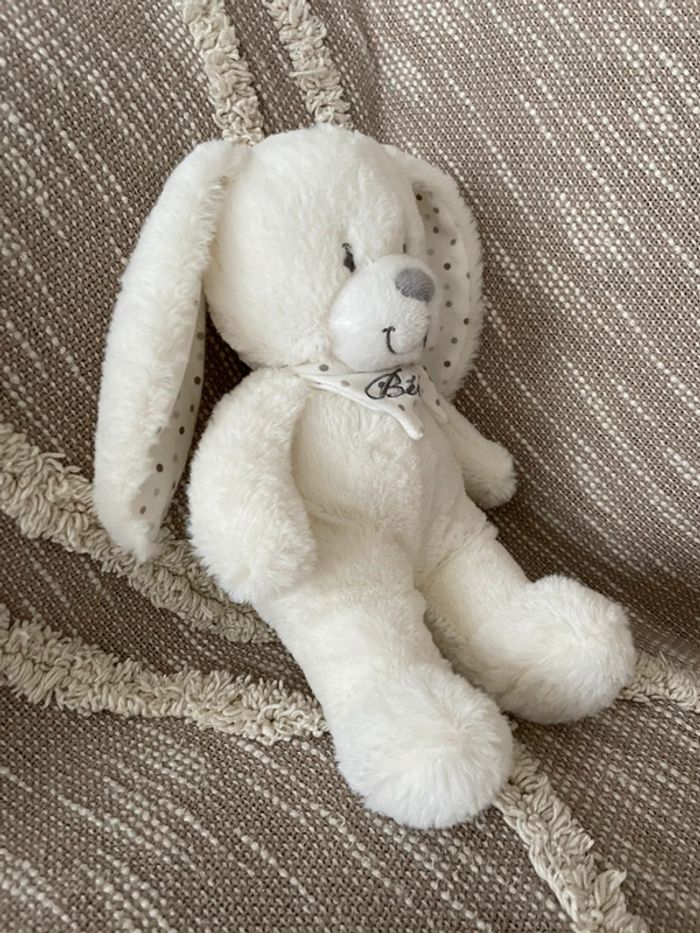Peluche doudou 27cm pommette lapin d’éveil blanc à pois très bon état - photo numéro 3