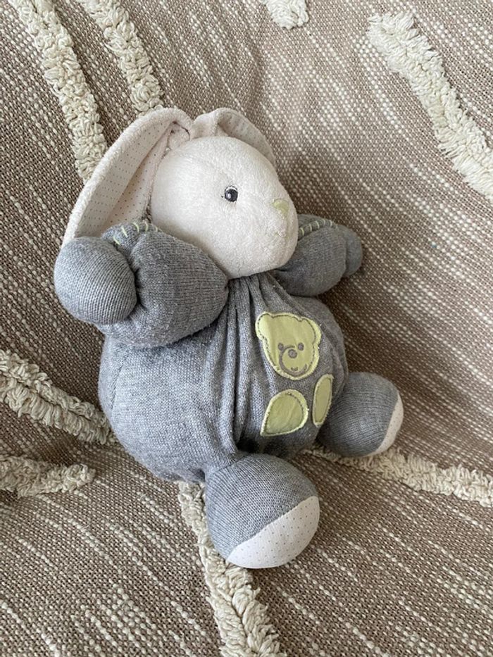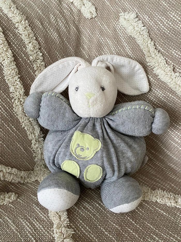 Peluche doudou boule 23cm Kaloo lapin blanc gris et vert très bon état - photo numéro 1