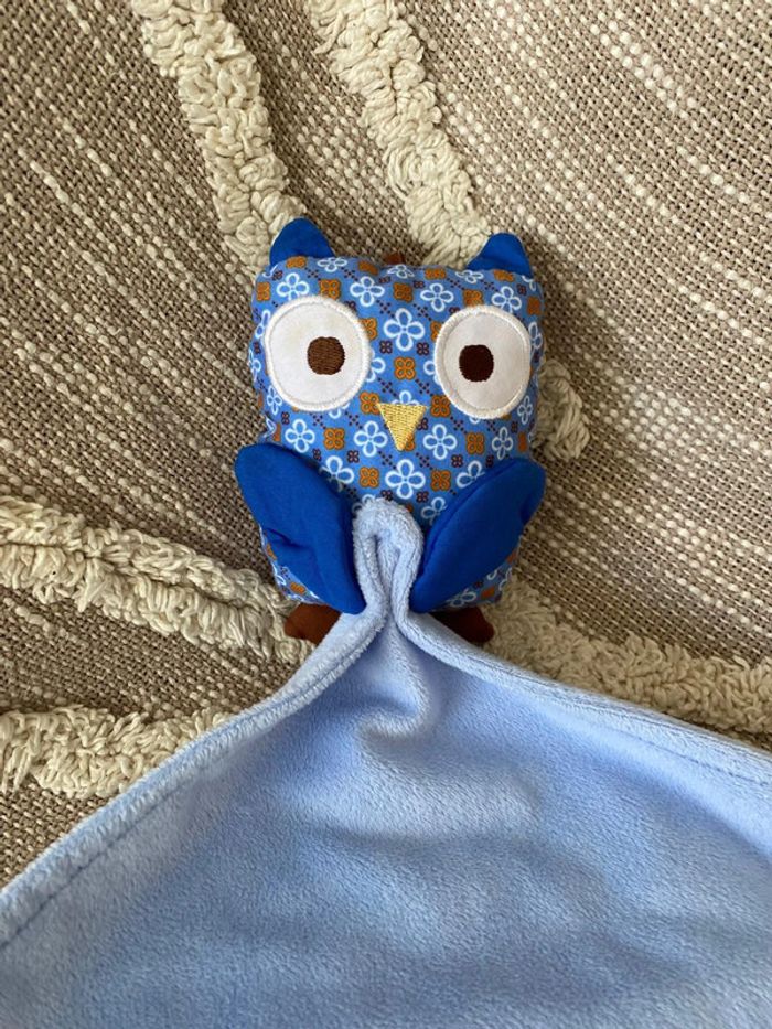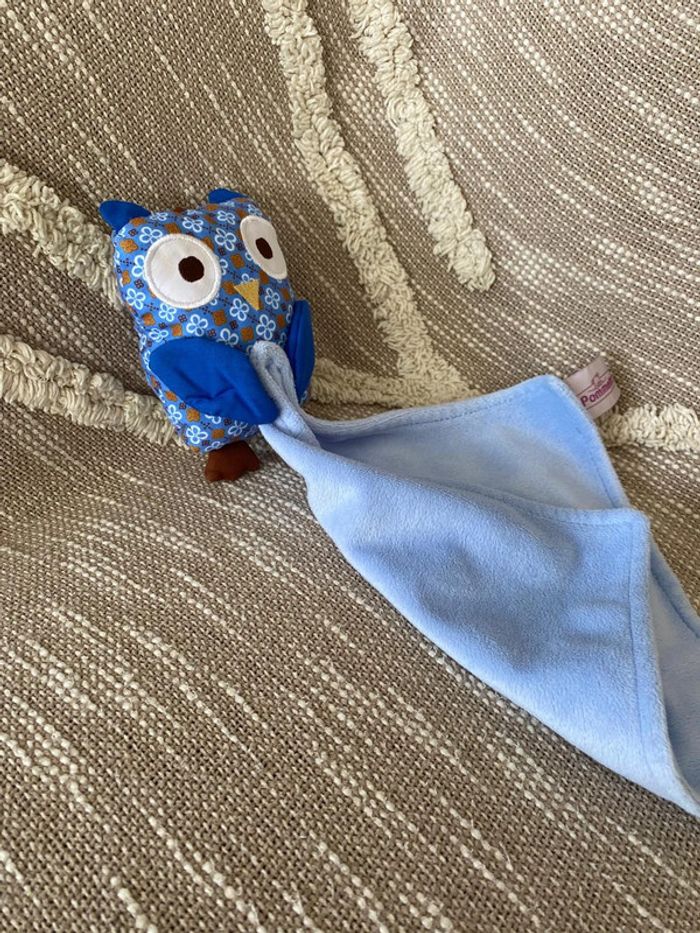 Peluche doudou mouchoir 13cm pommette hiboux chouette bleu à fleur très bon état - photo numéro 2