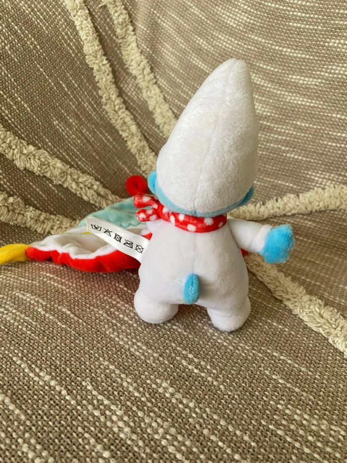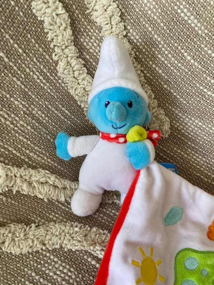 Peluche doudou mouchoir 16cm schtroumpfs bonhomme bleu blanc et rouge très bon état - photo numéro 5