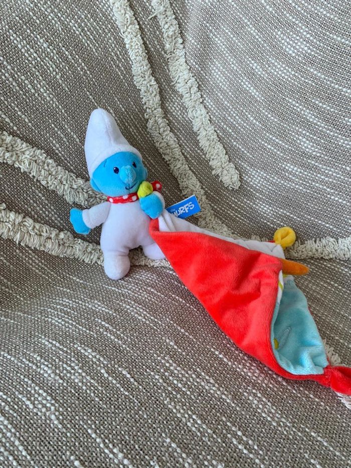 Peluche doudou mouchoir 16cm schtroumpfs bonhomme bleu blanc et rouge très bon état - photo numéro 4