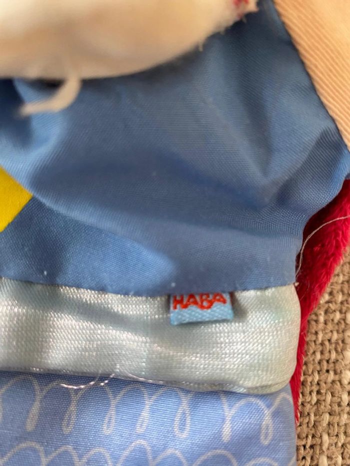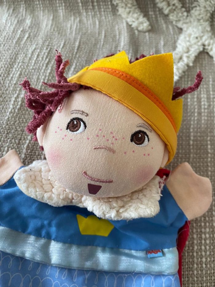Peluche doudou marionnette 25cm Haba poupée garçon roi prince bleu et rouge très bon état