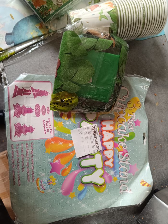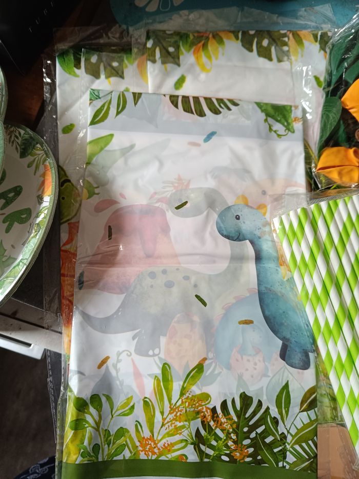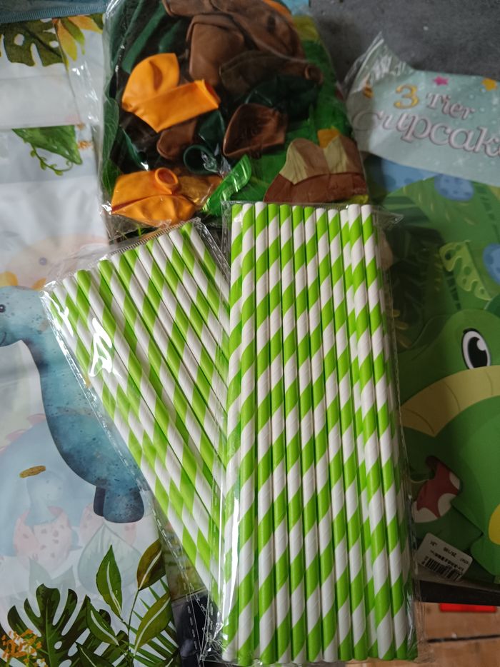 Un gros kit anniversaire dinosaure comprenant 40 verres carton 2 paquets de serviettes papier 50 pailles carton Un présentoir en carton cupcake 1 paquet de ballons 3 nappes en plastique 4 paquets de petites assiettes carton