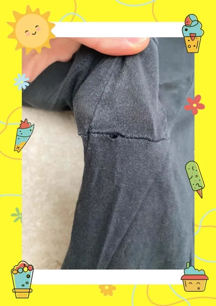 Trou sous une aisselle. La couleur n’est pas uniforme/il y a des traces. L’imprimé craquelle. Il n’y a plus l’étiquette. La matière est fine. Dimensions : Aisselles à aisselles : 52 cm Longueur : 70 cm