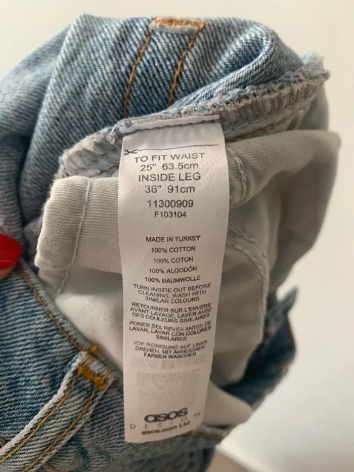 Taille 25/36 (équiv. 34/36 FR) Matière : 100 % coton Coupe droite/relax, style “mom fit”, en denim bleu clair. taille haute Spécial grande taille (longueur d’entrejambe 91 cm – idéal pour les grandes). 100 % coton, made in Turkey. État : Très bon car peu porté 💌 Envoi rapide & soigné avec mondial relais 💬 N’hésitez pas si vous avez des questions ! #asosdesign #jeantall #denim #grandetaille #jeanfemme #asos