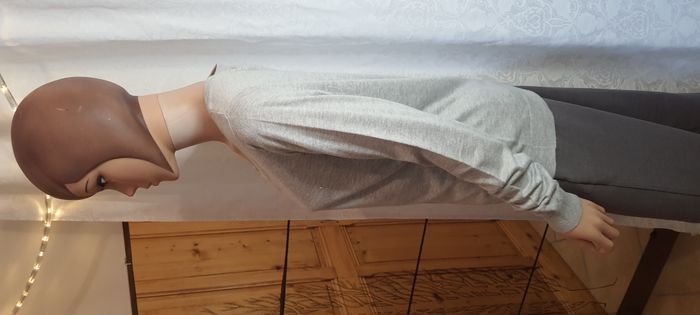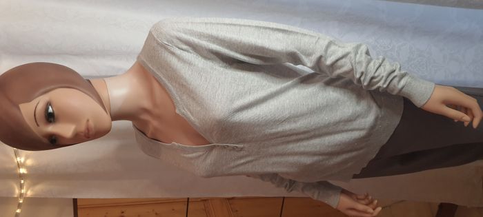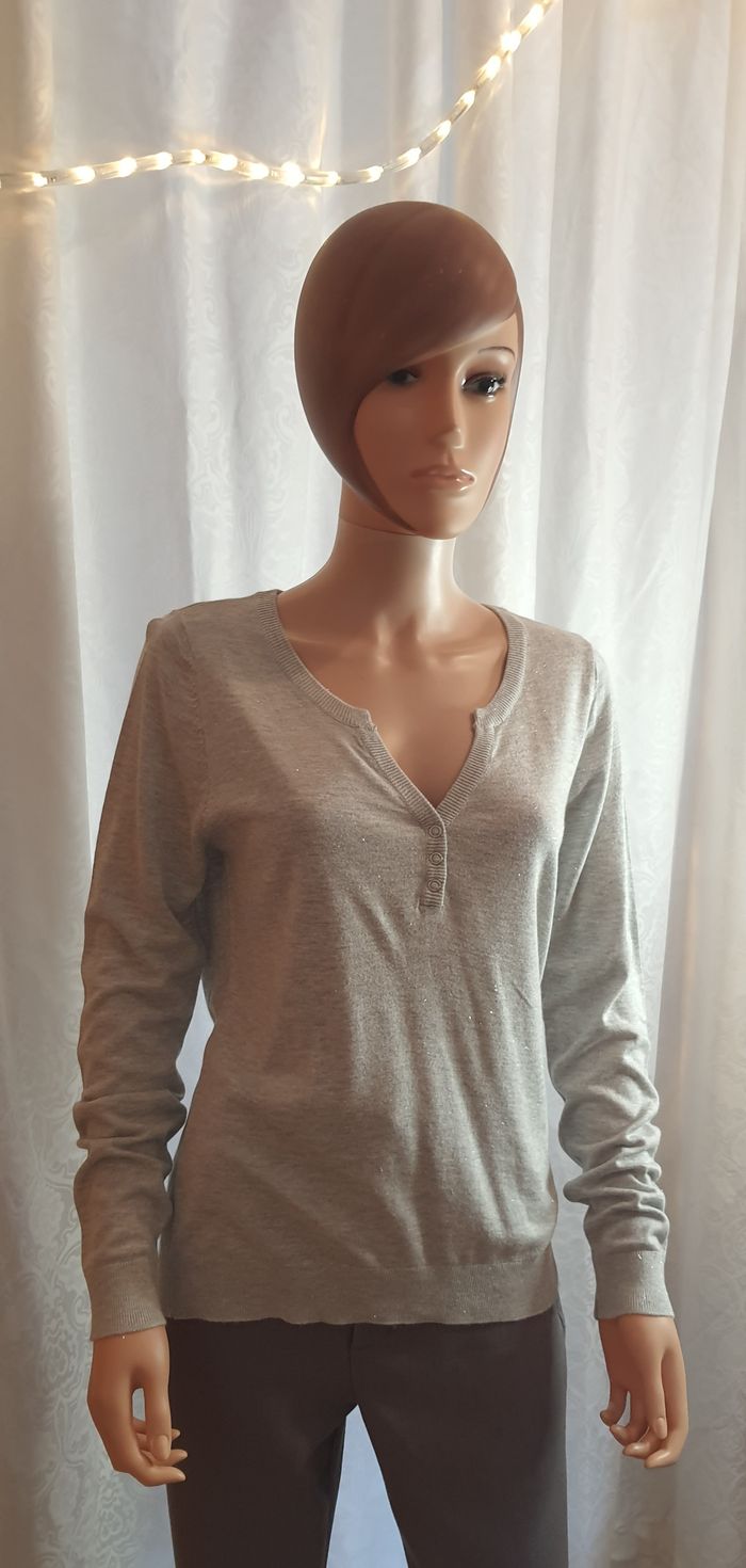 #cocy7310femme #40femmeLcocy7310 Pull fin gris femme #Camaïeu Taille L, gris, fibres métal argenté Col V, boutons pressions, manche longue Dimensions à plat: épaule 40cm., sous aisselle 48 cm. Hauteur 64 cm.