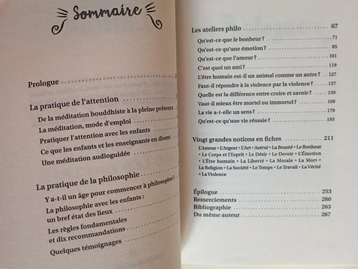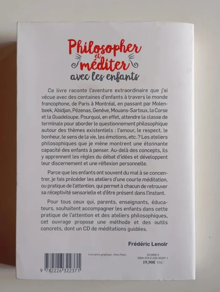 Ce livre raconte l'aventure extraordinaire que Frédéric Lenoir a vécue avec des centaines d'enfants à travers le monde francophone. Pourquoi, en effet, attendre la classe de terminale pour aborder des questions existentielles : l'amour, le respect, le sens de la vie, les émotions, etc. ? Les ateliers philosophiques montrent l’étonnante capacité des enfants à penser. Au-delà des concepts, ils y apprennent les règles du débat d'idées et développent leur discernement et une réflexion personnelle. Ces ateliers sont précédés d’une courte méditation qui aide chacun à être présent dans l’instant et à mieux se concentrer. Frédéric Lenoir est philosophe et sociologue. Il mène depuis plusieurs années une réflexion sur la sagesse et l’art de vivre. Il est l’auteur de nombreux livres – essais et romans –, traduits dans le monde entier. • UNE MÉTHODE CONCRÈTE à destination des parents, enseignants, éducateurs qui souhaitent accompagner les enfants. • Des OUTILS, des conseils, des FICHES de notions. • Des CLÉS POUR COMPRENDRE LA MÉDITATION et la pratique de l’attention Éditeur ‏ : ‎ Albin Michel 272 pages Dimensions ‏ : ‎ 14.1 x 2.3 x 20.5 cm Livre en état (car vendu sans CD) Je vends d'autres livres de Frédéric Lenoir #phil_peg_fredericlenoir #fredericlenoir #philosopher #méditer #méditationpleineconscience #philoenfant