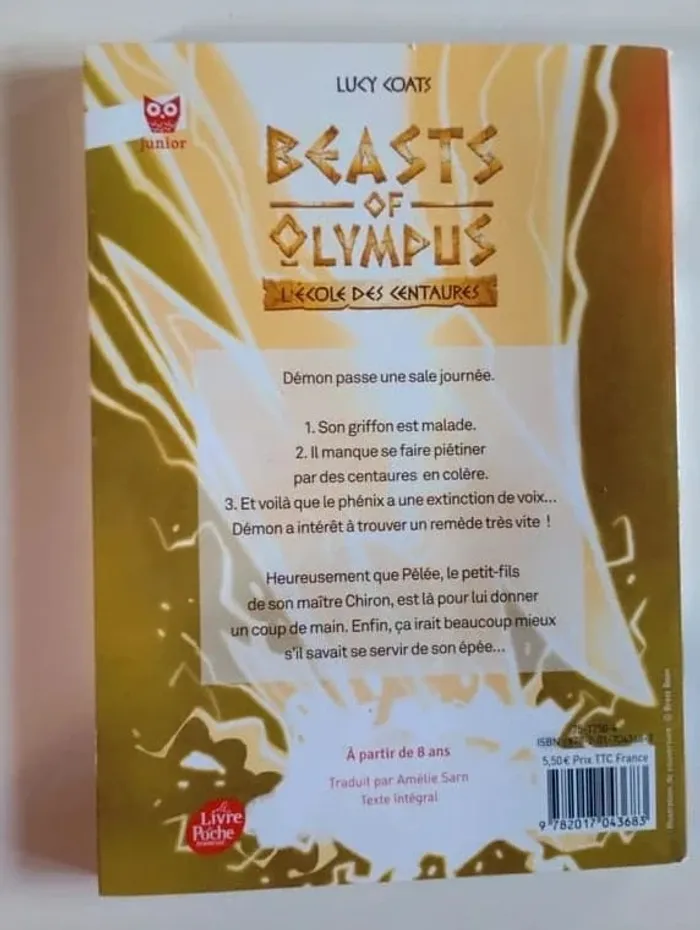 Démon passe une sale journée. 1. Son griffon est malade. 2. Il manque se faire piétiner par des centaures en colère. Et voilà que le phénix a une extinction de voix… Démon a intérêt à trouver un remède très vite ! Heureusement que Pélée, le petit-fils de son maître Chiron, est là pour lui donner un coup de main. Enfin, ça irait beaucoup mieux s’il savait se servir de son épée… Éditeur ‏ : ‎ Livre de Poche Jeunesse 128 pages Âge de lecture ‏ : ‎ 8 - 12 ans Dimensions ‏ : ‎ 12.7 x 0.8 x 17.8 cm Livre en très bon état #phil_peg_mythologie #griffon #centaure #épéé