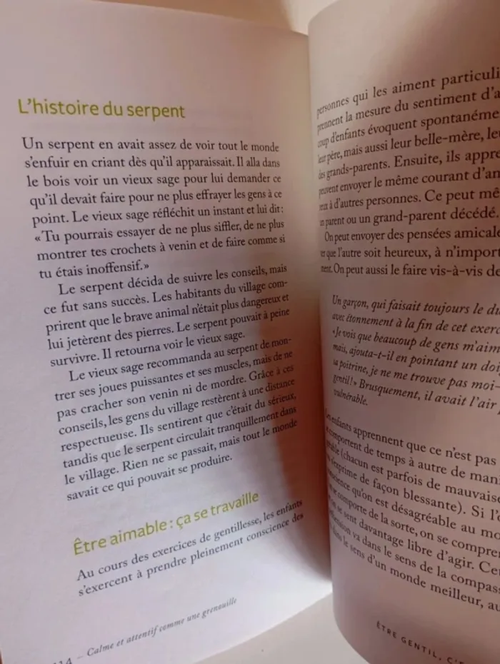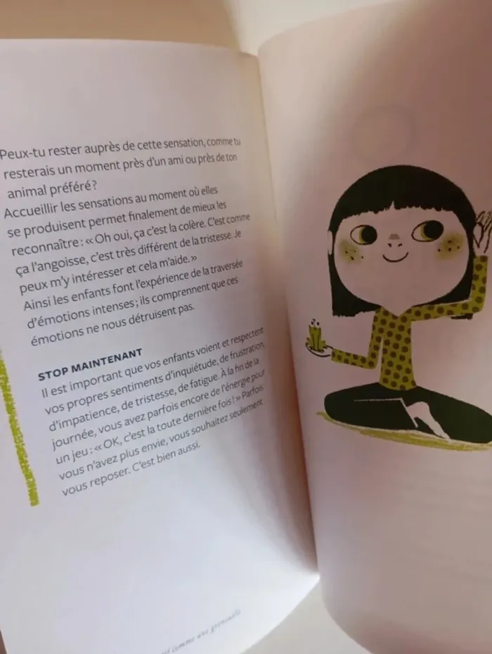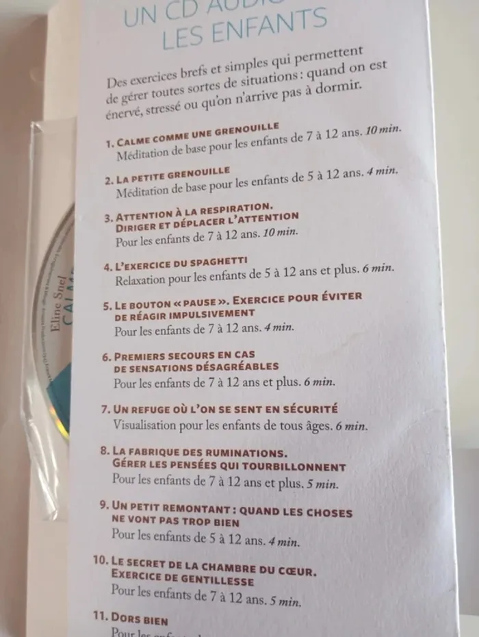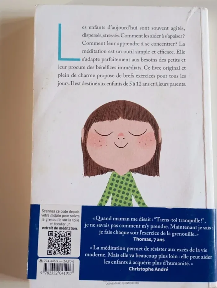Les enfants d'aujourd'hui sont souvent agités, dispersés, stressés. Comment les aider à s'apaiser ? Comment leur apprendre à se concentrer ? La méditation est un outil simple et efficace. Elle s'adapte parfaitement aux besoin des petits et leur procure des bénéfices immédiats. Ce livre original et plein de charme propose de brefs exercices pour tous les jours. Il est destiné aux enfants de 5 à 12 ans et à leur parents. Éditeur ‏ : ‎ Les Arenes 132 pages Dimensions ‏ : ‎ 14.2 x 1.5 x 22.5 cm Prix éditeur : 25€ Livre + cd en très bon état (Quelques traces sur la couverture) Je vends d'autres ressources pour la méditation enfant #phil_peg_méditation #méditation #pleineconscience